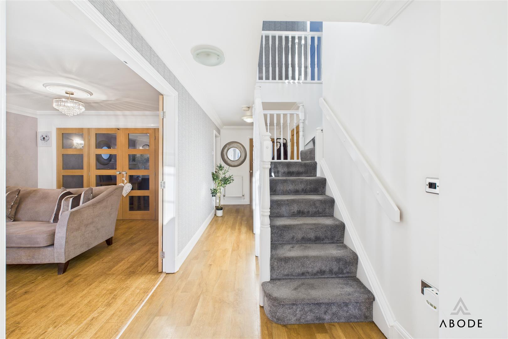 A wide, welcoming entrance hallway sets the tone, with stairs rising to the first floor and doors leading off to the principal reception rooms.