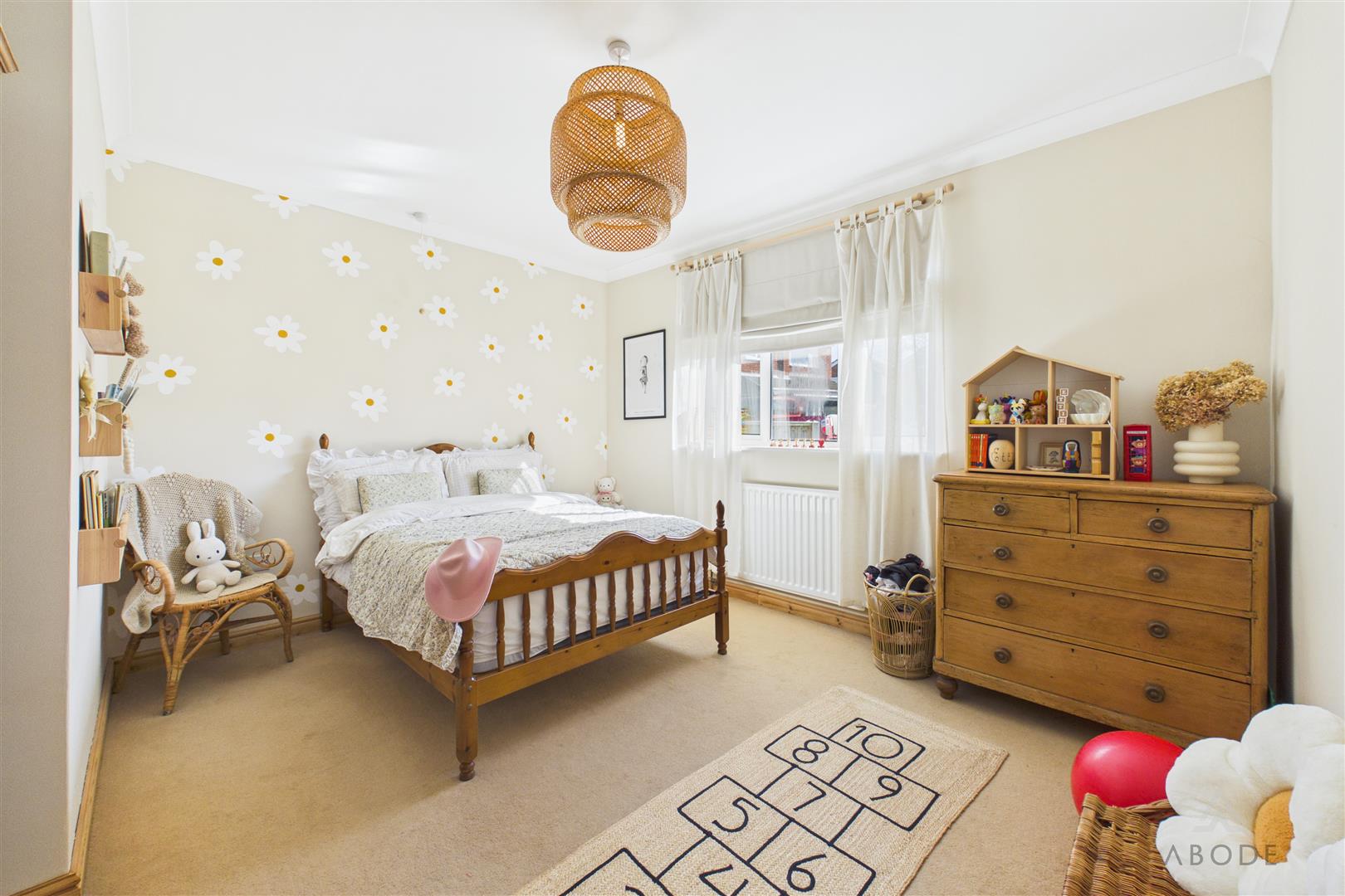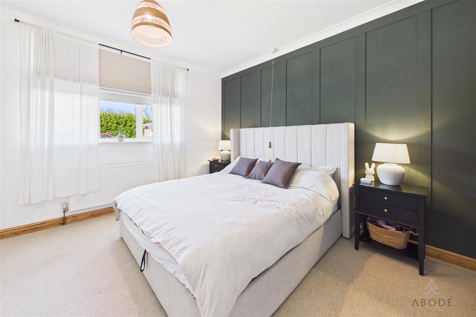 A well-proportioned bedroom with a uPVC double glazed window to the front elevation, central heating radiator, TV aerial point, and a feature panelled wall.