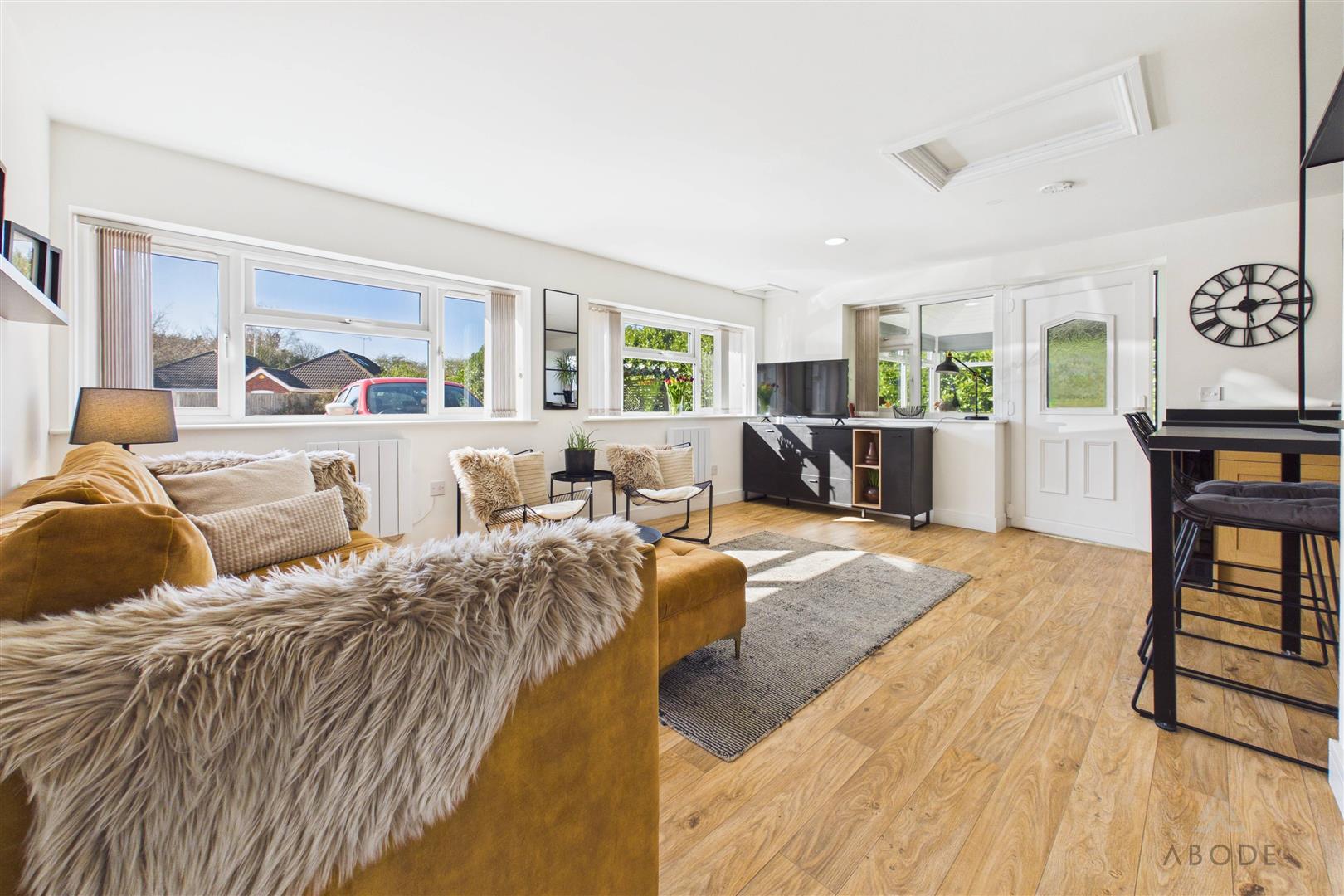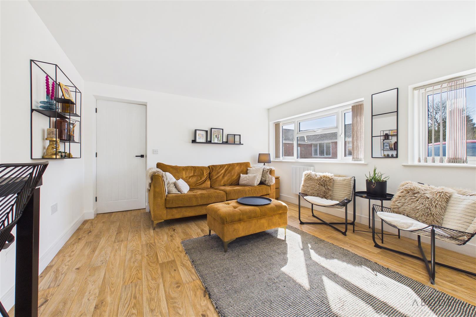 A bright and comfortable living room featuring three uPVC double glazed windows to the rear and side elevations, allowing excellent natural light. The room also benefits from two central heating radiators and a TV aerial point.