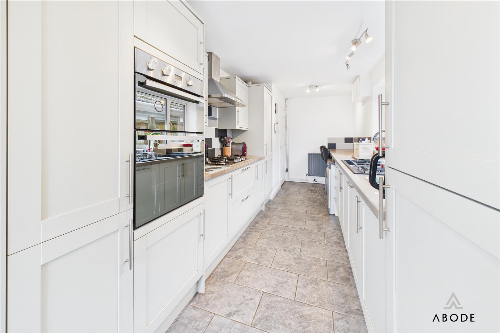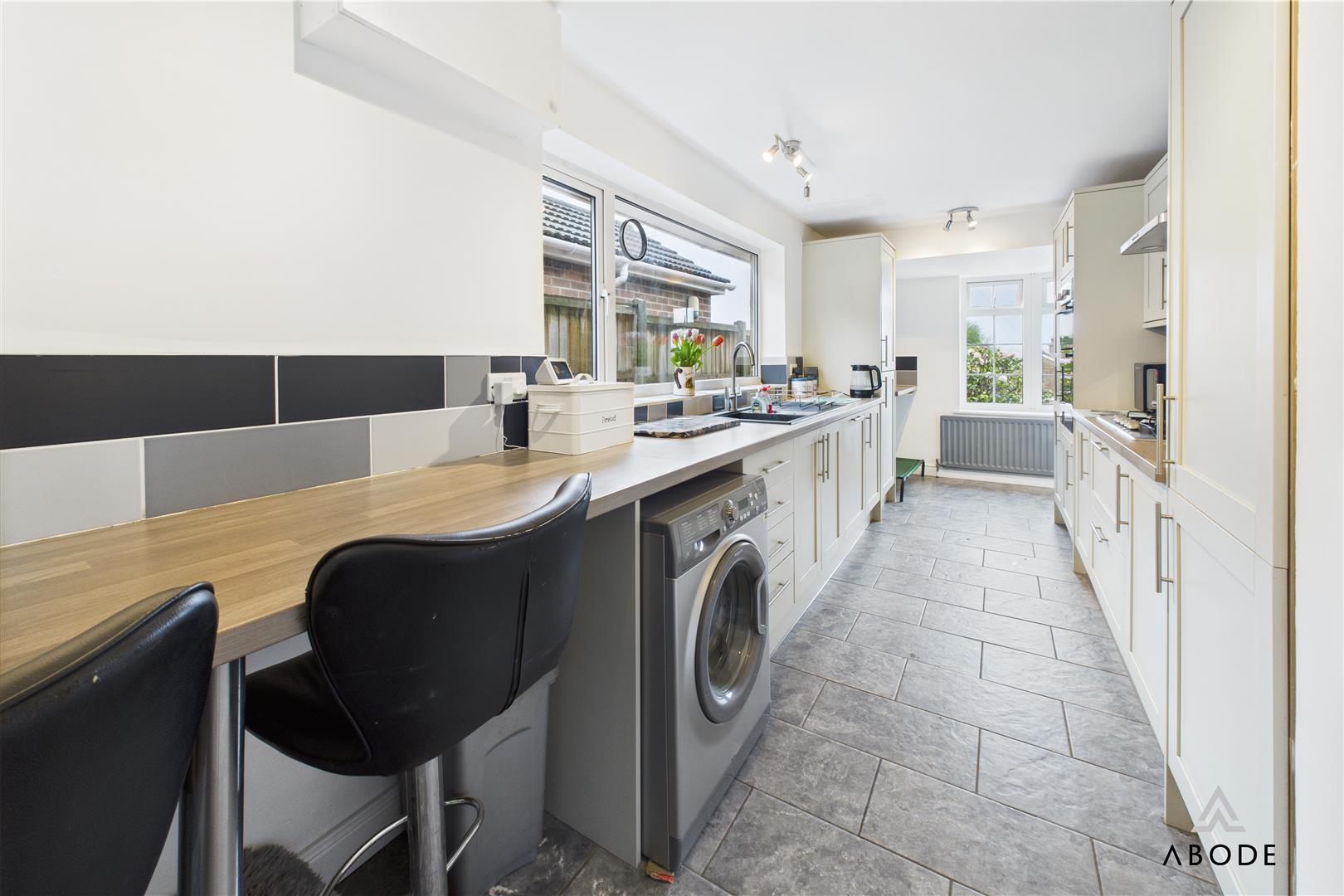 Entrance door into the fitted kitchen offering wall mounted, base and drawer units with work surfaces and a breakfast bar. Sink and drainer unit, fitted electric double oven, gas hob and…