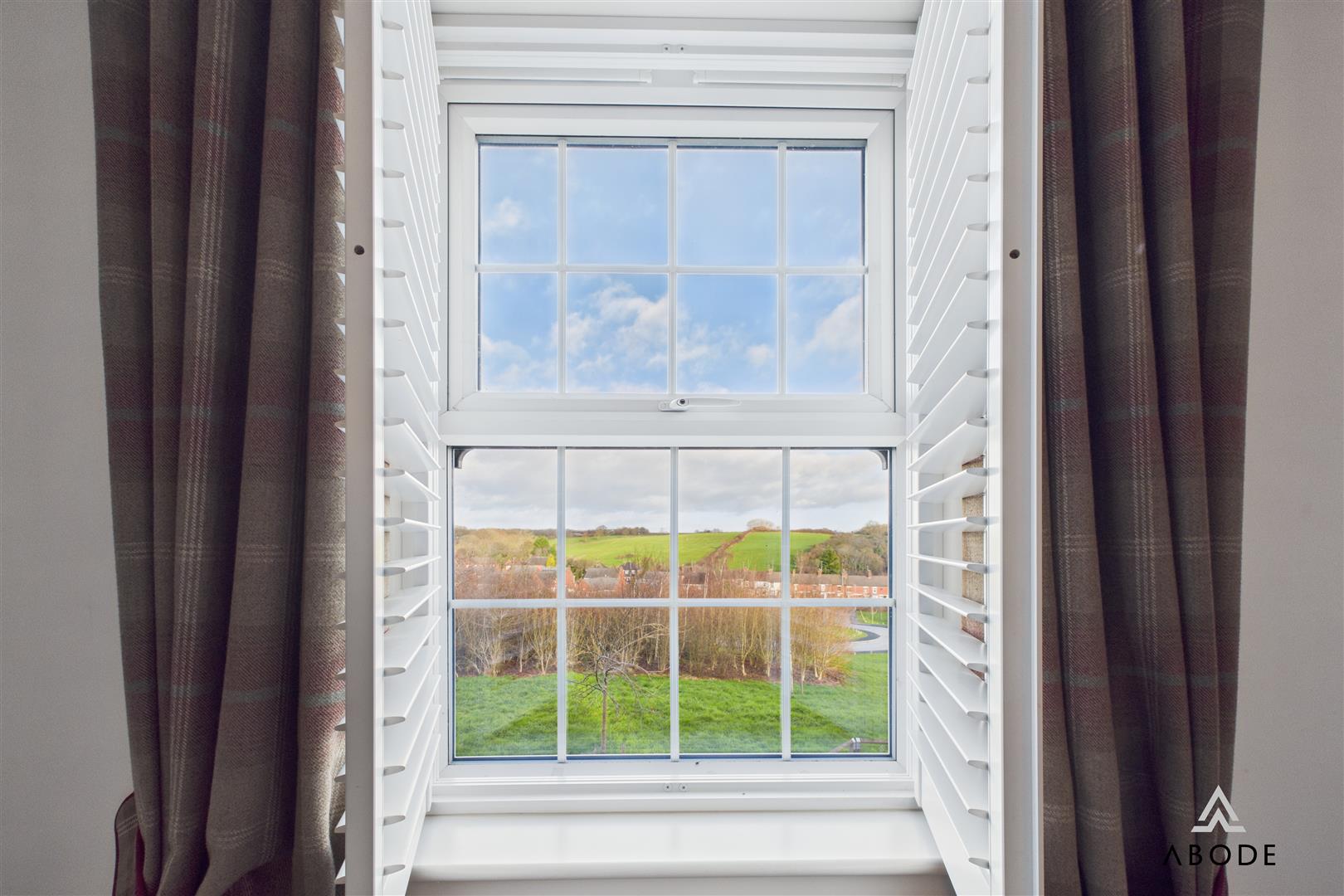 The principal bedroom is an excellent size and features built-in wardrobes and a private en-suite shower room. A particular highlight is the window with shuttered finish offering a beautiful, elevated view across surrounding greenery — a charming outlook to wake up to each morning.