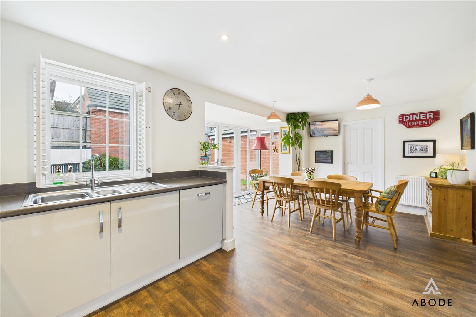 To the rear, the open-plan kitchen and dining area forms the heart of the home. The kitchen is fitted with sleek modern cabinetry, integrated appliances, generous worktop space, and a window to the side elevation with shutters. The dining area extends into a garden-facing room with full-width glazing and French doors opening directly onto the patio. This versatile space is perfect for family gatherings and sociable meal times, with ample room for a large dining table and additional seating.