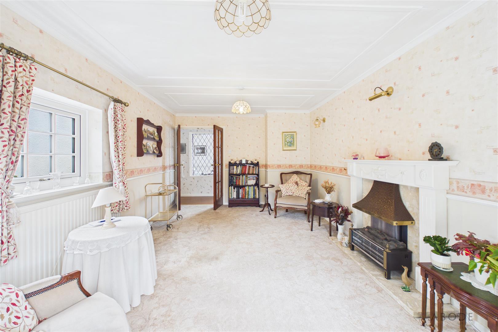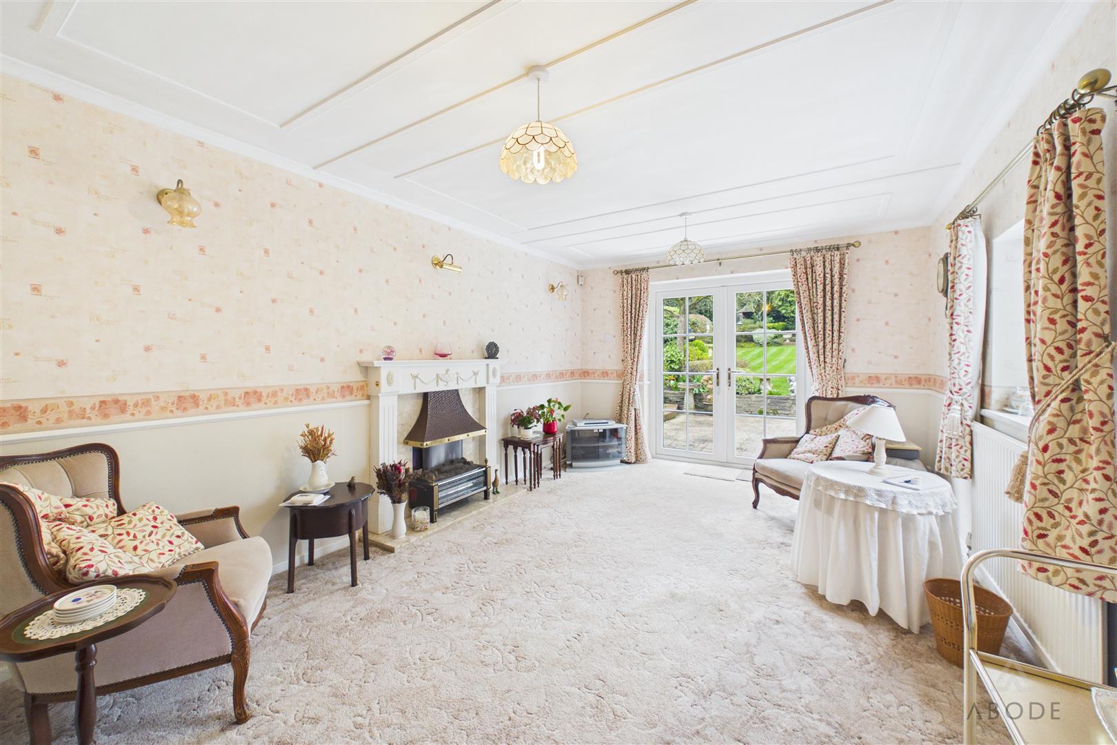 To the rear elevation is the main sitting room, a particularly generous reception space enjoying views over the garden and benefiting from French doors that open directly onto the rear patio, allowing for a pleasant connection between the indoor living space and the outdoor entertaining area. A feature fireplace forms a focal point within the room.