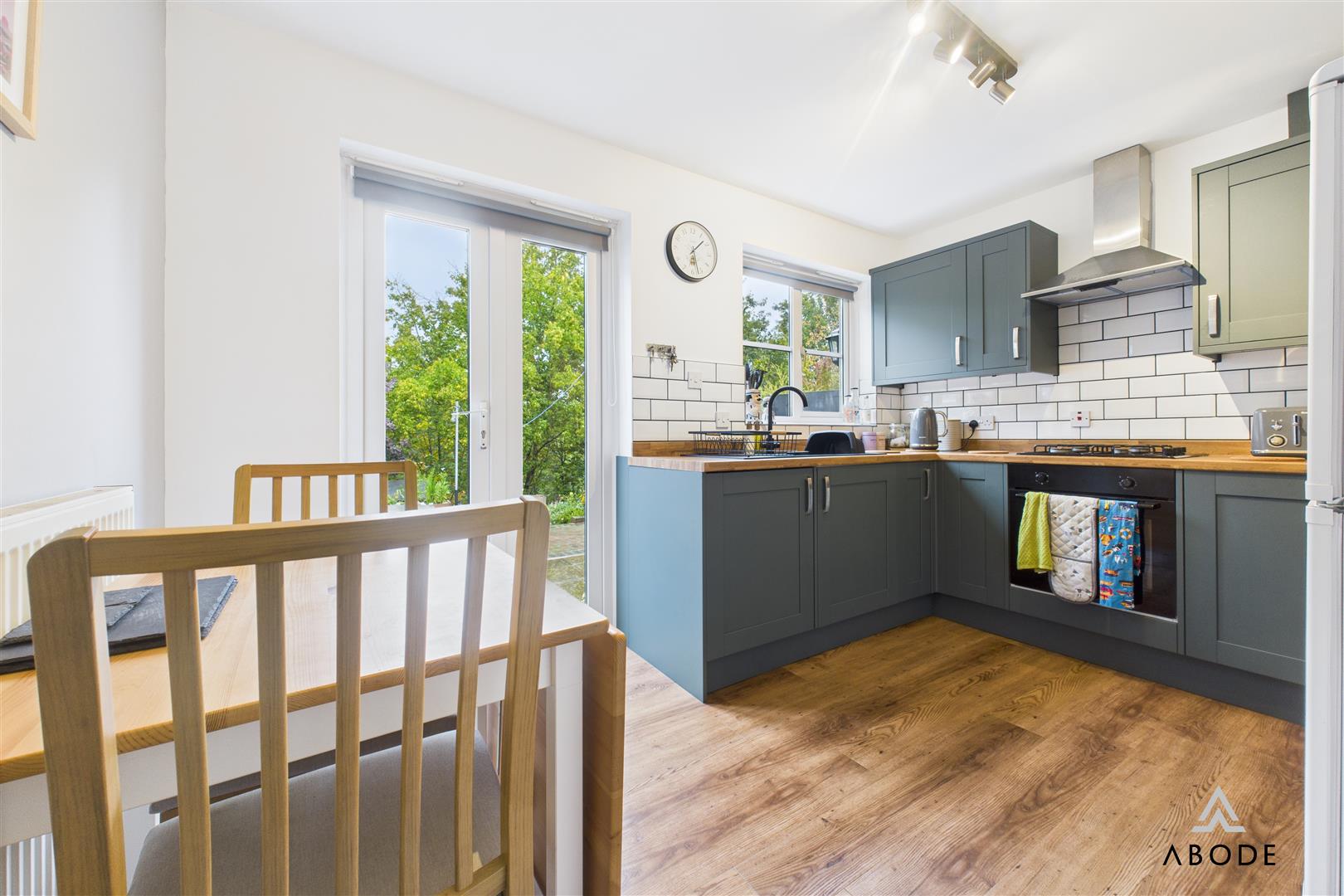 A composite front door opens into a welcoming porch with timber flooring, leading to a bright lounge with a front-facing UPVC double-glazed window and staircase to the first floor. To the rear, a spacious kitchen diner is filled with natural light from French doors and is fitted with modern units, wood block effect worktops, integrated appliances, a pantry and space for white goods.