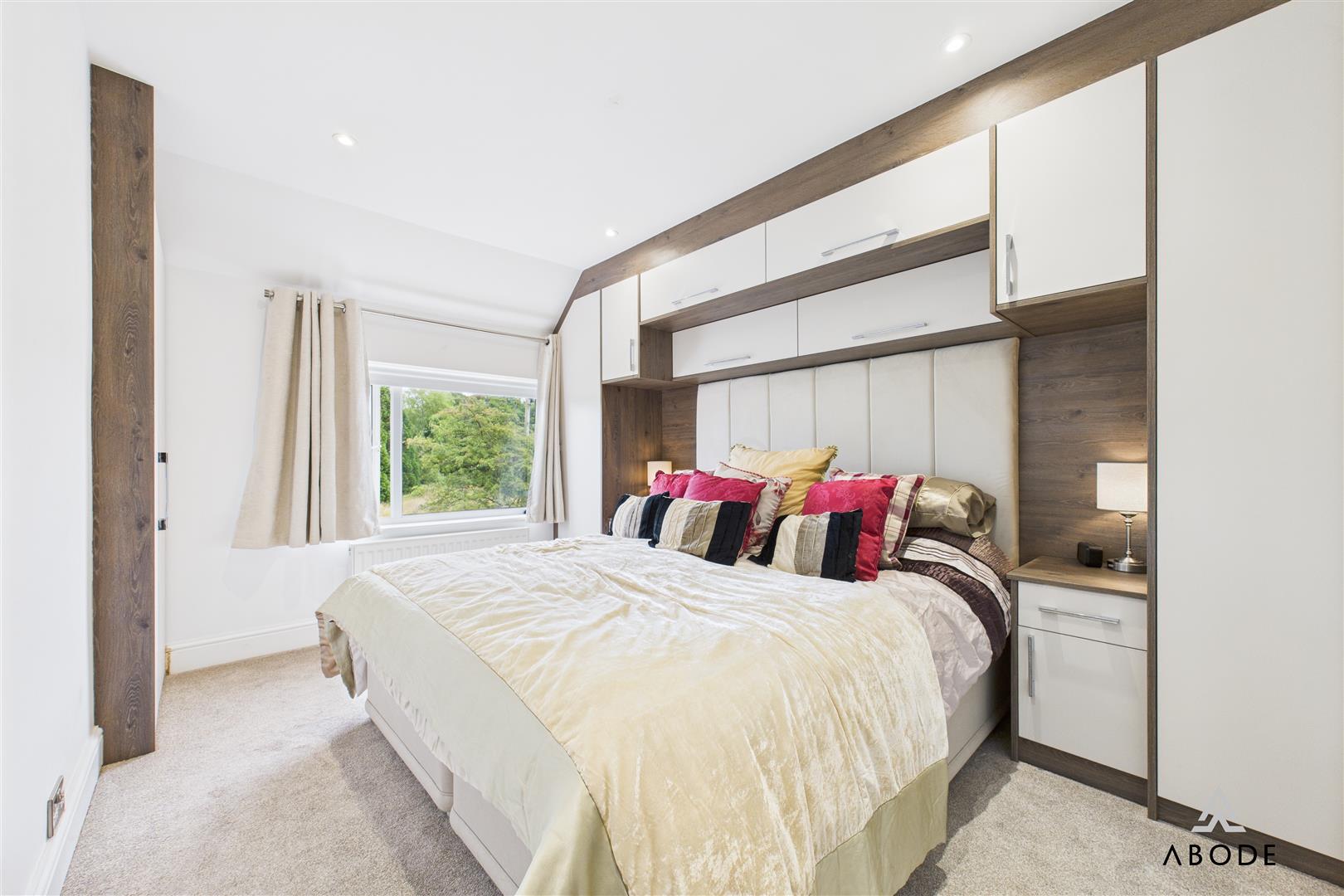 A bright and spacious room with a UPVC double-glazed window to the front elevation, central heating radiator, LED spotlights, telephone point, and a comprehensive range of bespoke fitted wardrobes and cupboards. Includes walk-in wardrobe with shelving and hanging rails, as well as over-stairs storage.