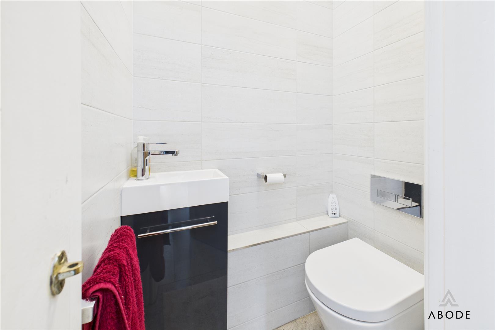With modern tiling to floor and walls, the room includes a low-level WC with continental flush, wash hand basin with mixer tap, and towel rail.