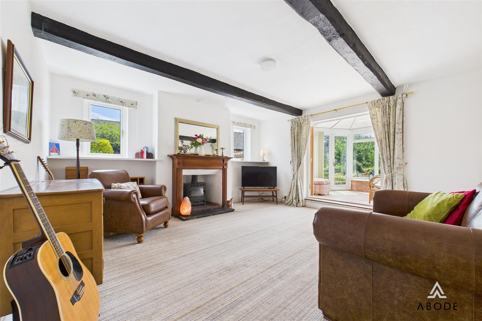 A characterful and inviting reception room featuring two UPVC double-glazed windows to the side elevation, allowing plenty of natural light. The original ceiling beamwork adds charm and authenticity, while the focal point of the room is the cast iron log-burning fireplace, beautifully framed by a timber Adam-style surround. The room is warmed by a central heating radiator and includes an internal door providing access down to the cellar. A set of double doors opens into the conservatory.