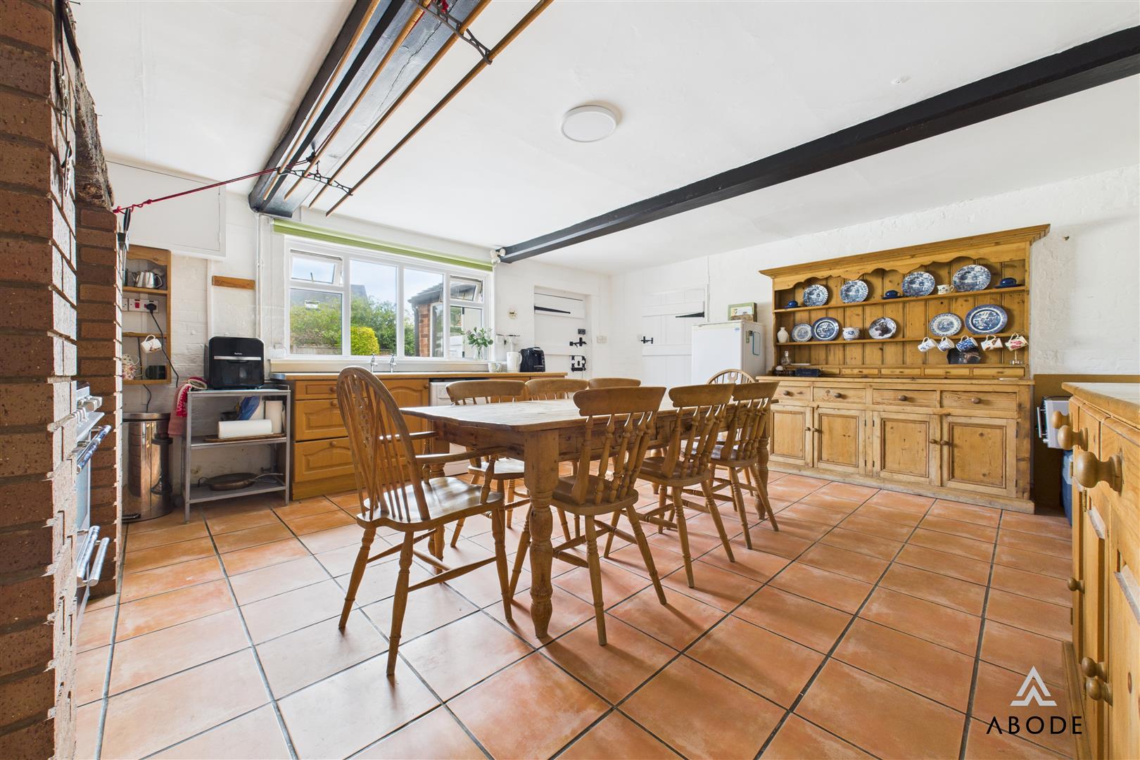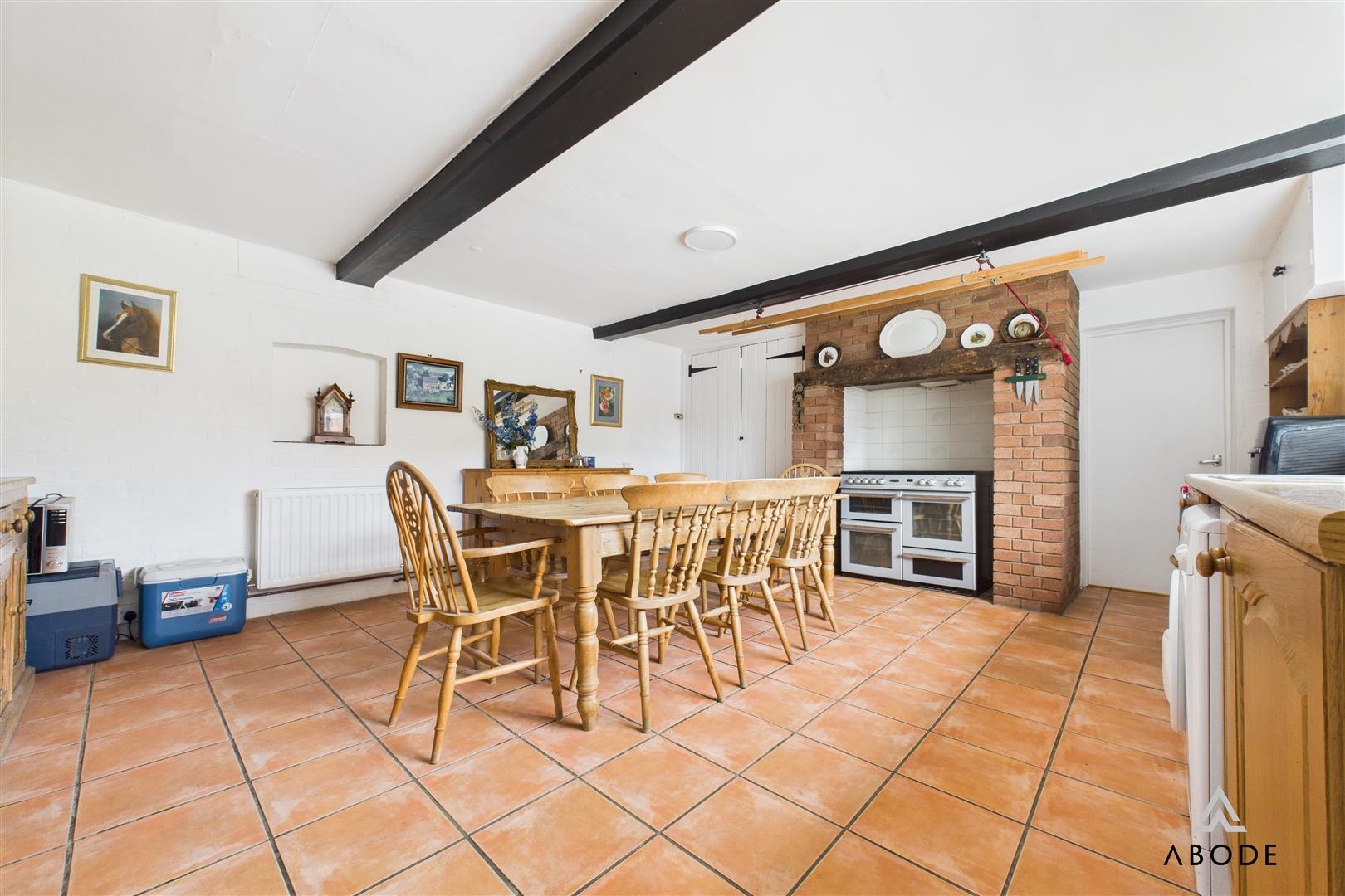 This delightful farmhouse kitchen enjoys a UPVC double-glazed window to the side elevation and tiled flooring throughout. A range of matching base-level storage cupboards are finished with wood-block effect roll-top work surfaces. Integrated appliances include a stainless steel sink and drainer with mixer tap. There is plumbing and space for both freestanding and undercounter white goods, along with a freestanding Rangemaster-style cooker complete with five hobs, warming plates, ovens, and grill. The room also offers two central heating radiators, a designated TV area and telephone point. Exposed original beamwork adds character, and a ceiling-mounted meter cupboard houses the electrical consumer unit and electric meter. An internal door leads to the WC.