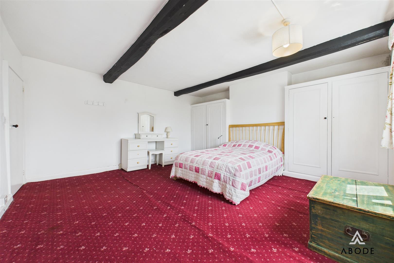 This bedroom benefits from a UPVC double-glazed window to the side elevation, a central heating radiator, and charming exposed ceiling beamwork.
