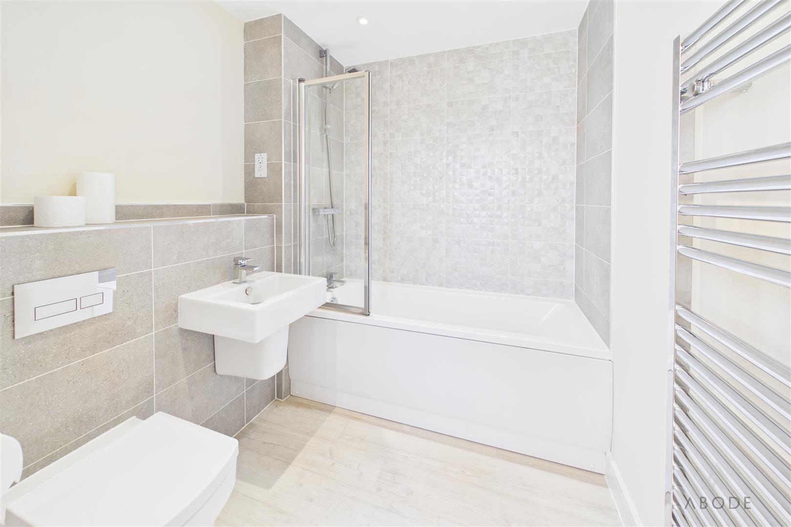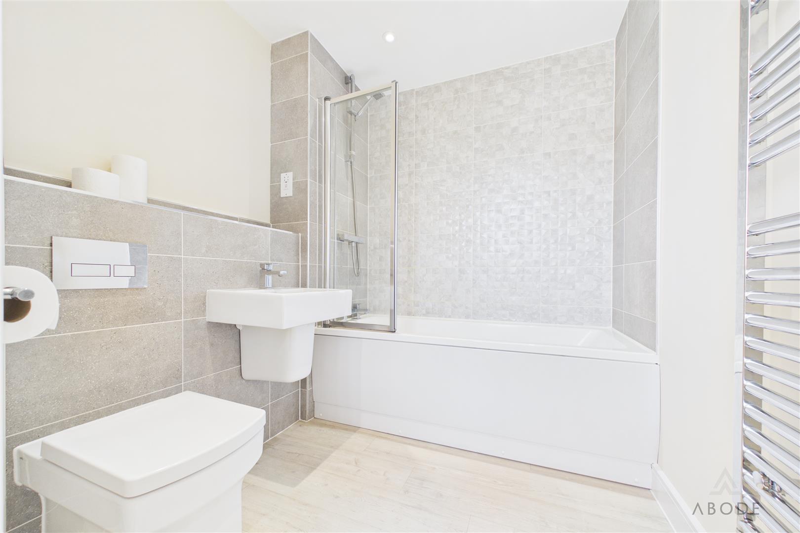 The bathroom is fitted with a modern three-piece suite, comprising a bath with shower over, wash hand basin, and low-level WC, finished with contemporary tiling.