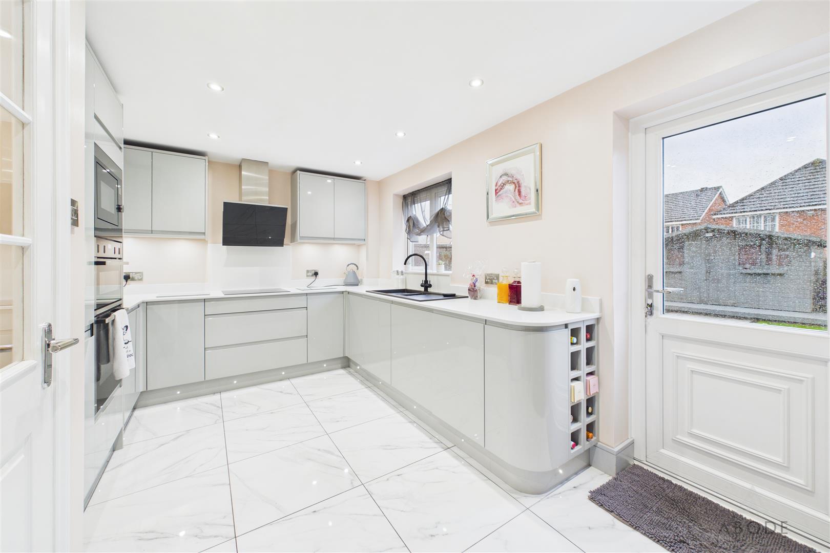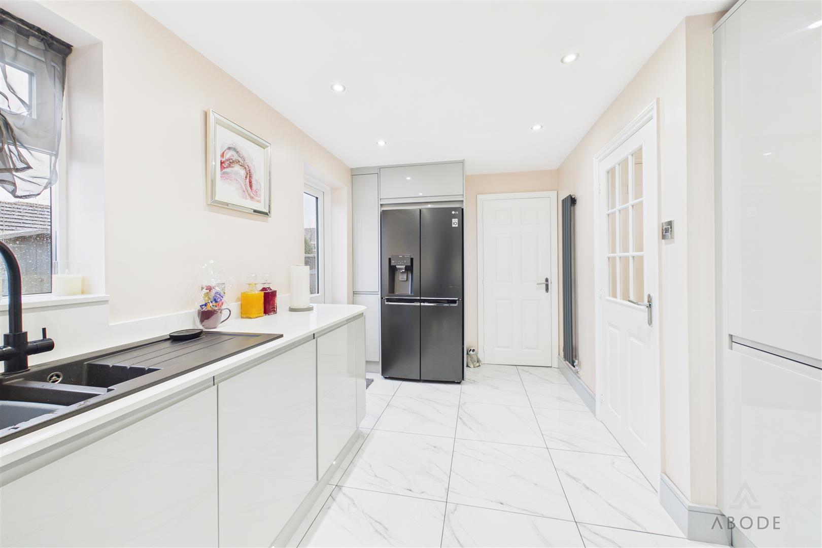 The kitchen is fitted with a modern range of wall and base units with complementary work surfaces and integrated appliances. There is space for additional freestanding appliances where required, and a rear access door leads directly out to the garden, providing practicality for day-to-day living.