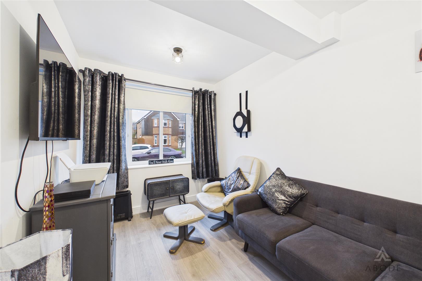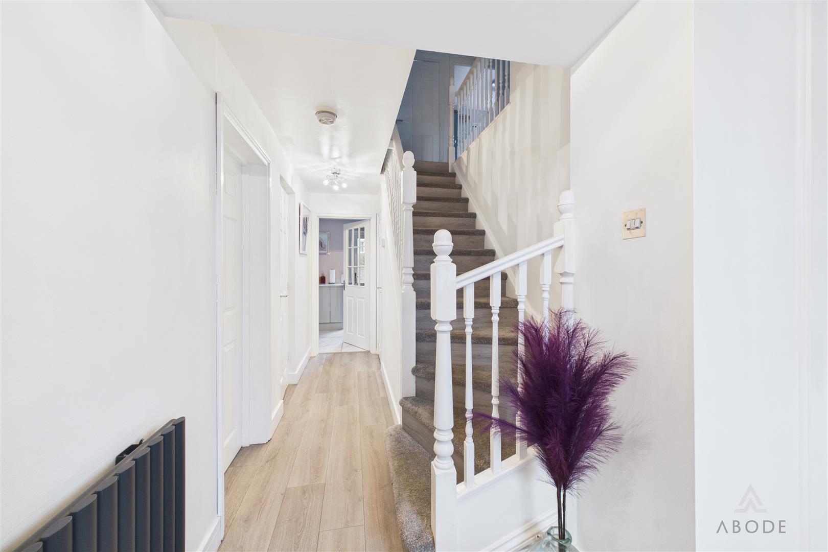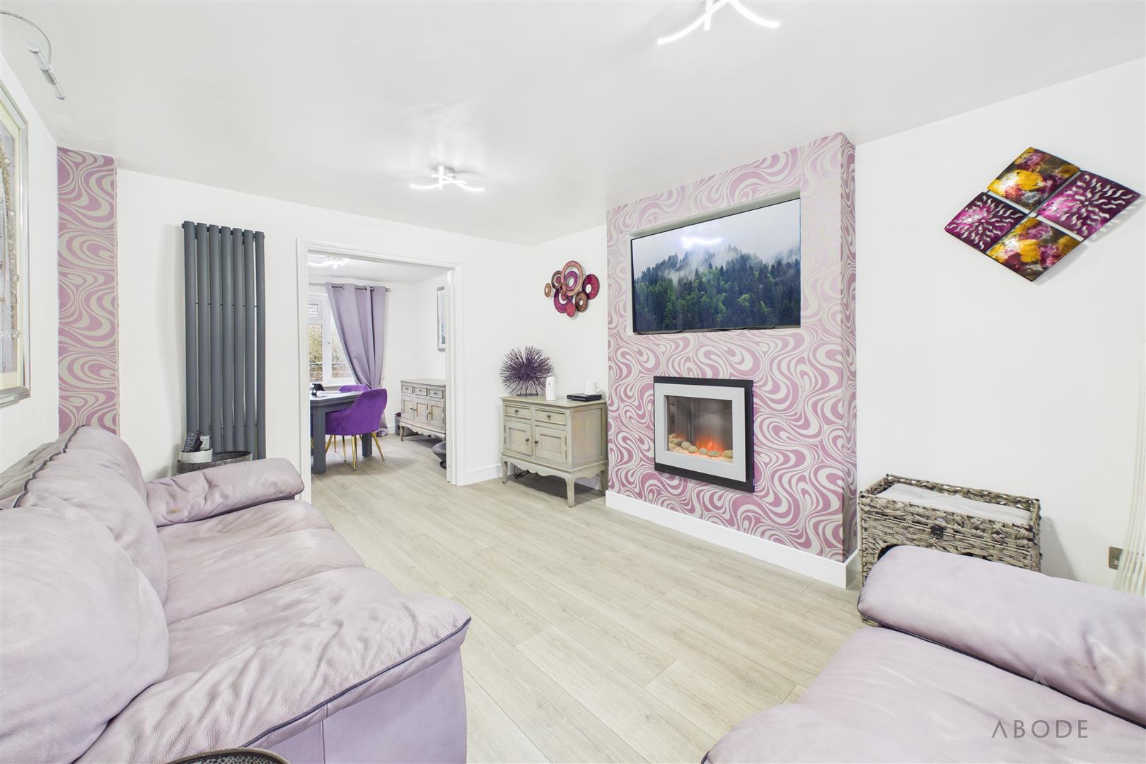 To the right-hand side is a spacious living room, enhanced by a bay window to the front elevation allowing for plenty of natural light. This room provides ample space for a full suite of lounge furniture and is centred around a contemporary feature fireplace with media wall above, creating a comfortable focal point for family living.