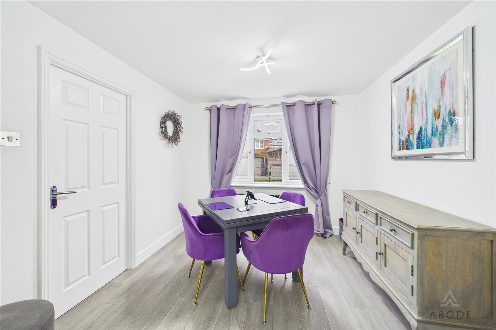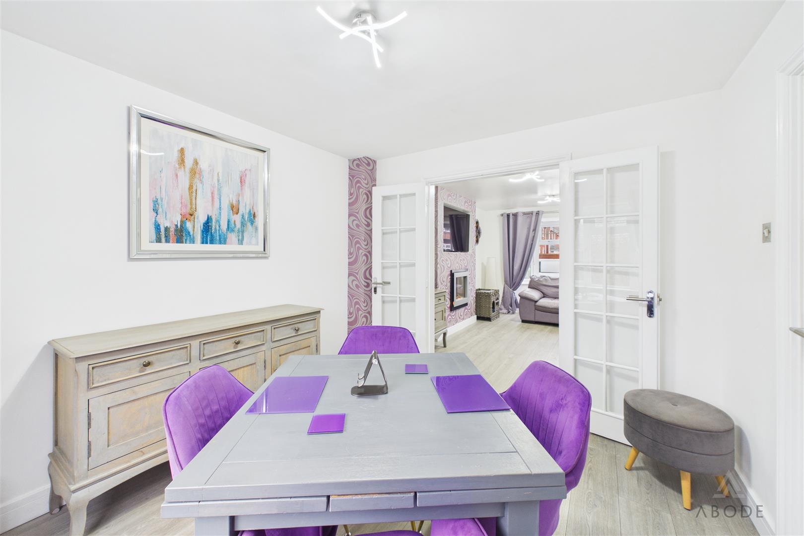 Double doors lead through to the dining room, positioned to the rear of the property and overlooking the garden. This room comfortably accommodates a family dining table and chairs and enjoys a pleasant outlook, making it ideal for entertaining.
