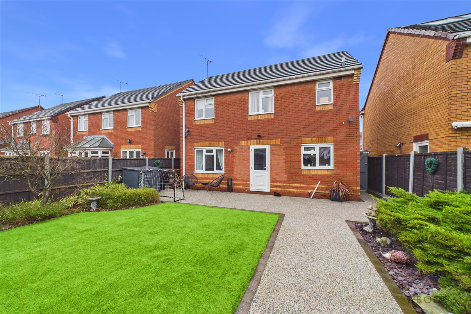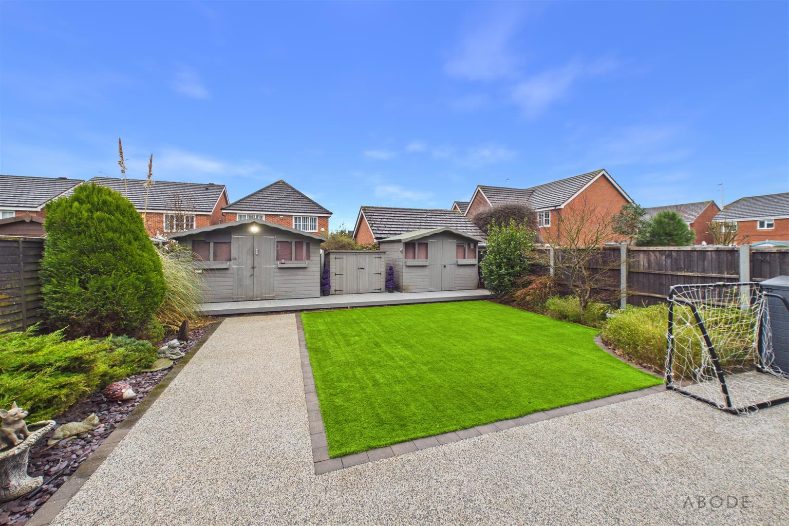 The rear garden has been landscaped for ease of maintenance and features a resin-style patio area, artificial lawn and well-stocked borders. The garden is fully enclosed by timber fencing, making it suitable for children and pets. To the rear boundary are substantial timber outbuildings, offering excellent storage or potential workshop space.