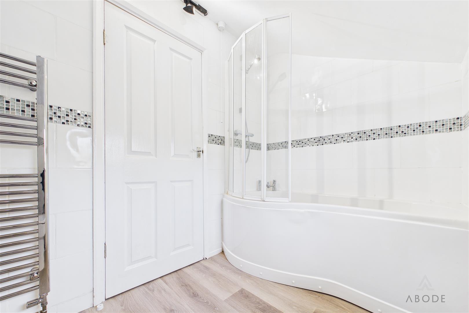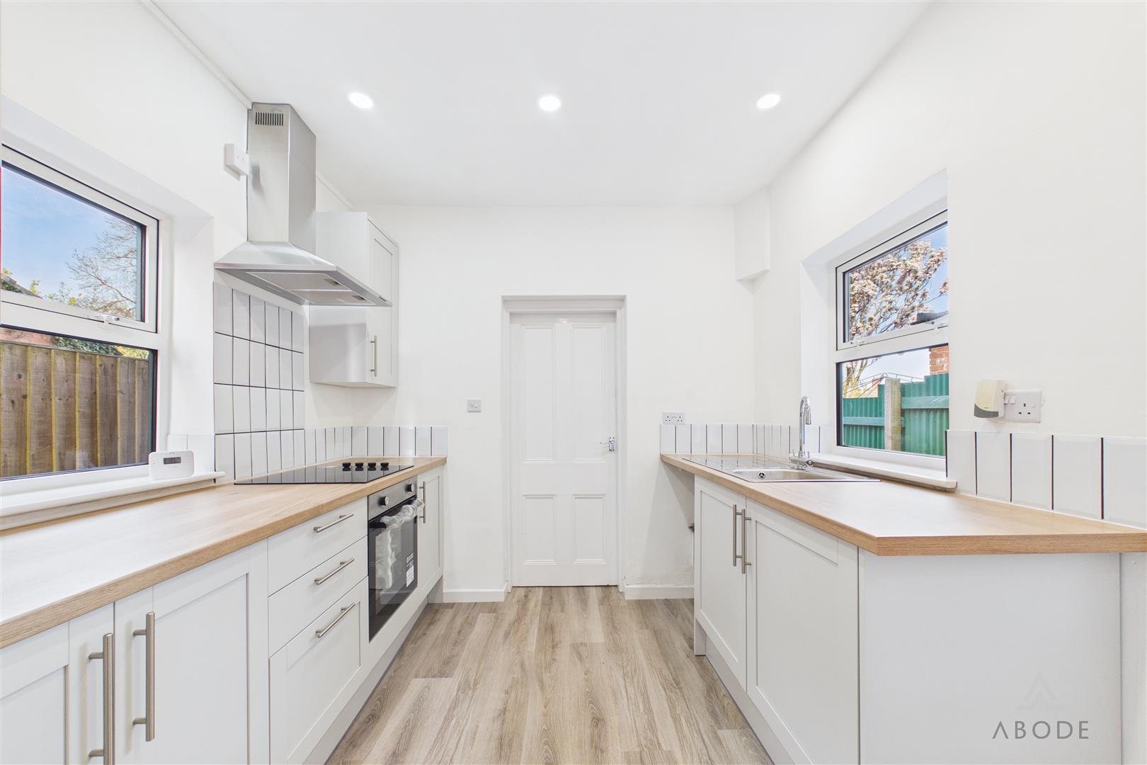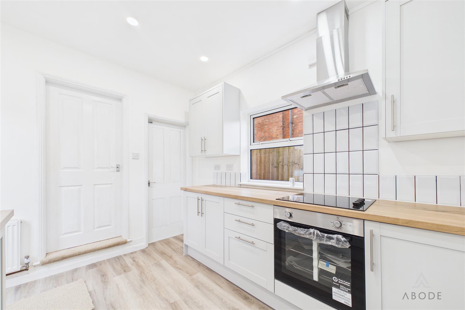 To the rear, the refitted kitchen has been finished with a range of modern wall and base units, complemented by wooden work surfaces and tiled splash backs. Integrated appliances include an oven with hob and extractor over, with space provided for additional white goods. The kitchen also offers access to the rear garden and adjoining utility area, along with a ground floor shower room fitted with a contemporary three-piece suite.