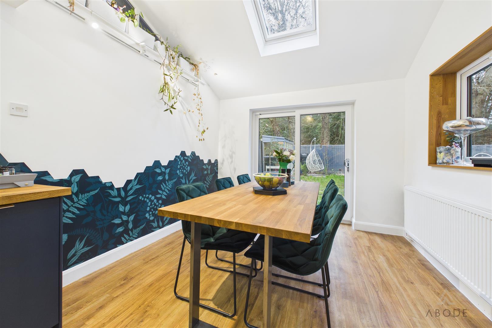 A standout feature is the cast-iron multi-fuel log-burning stove (13kWh), adding warmth and character. Spotlighting runs throughout, with UPVC double-glazed windows to the rear and dining area. The dining space enjoys a vaulted ceiling with feature glazing, central heating radiator and UPVC double-glazed sliding patio doors opening onto the rear garden, allowing plenty of natural light.