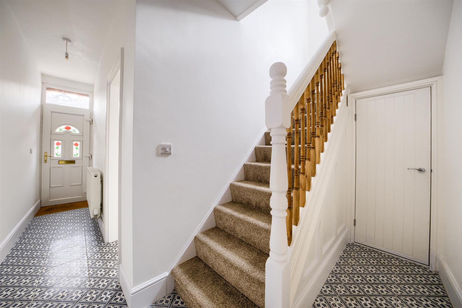 Composite entrance door into the hall with staircase to the first floor, under stairs storage cupboard and doors to -