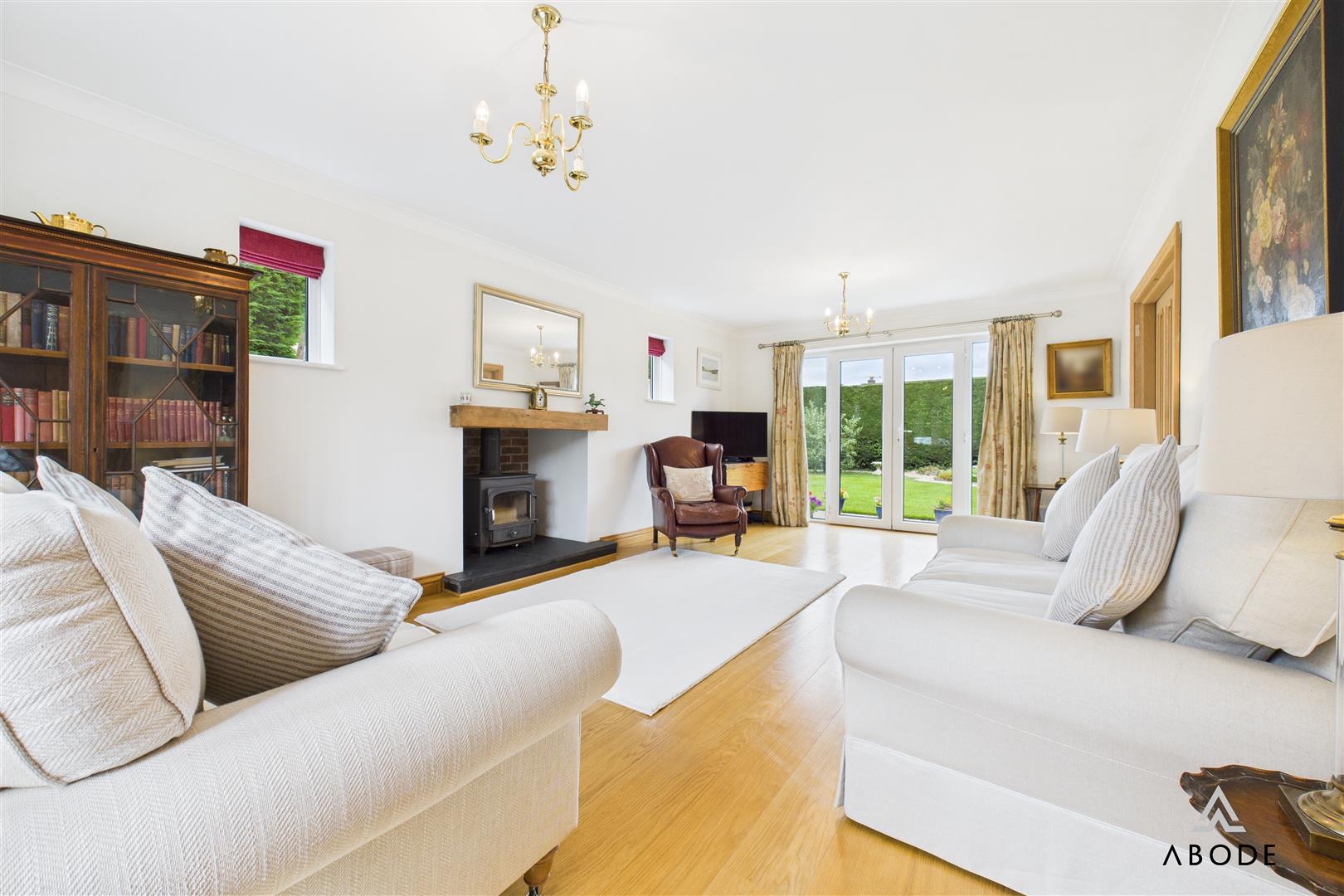 Outside, the property boasts a landscaped private lawned garden with well-stocked flowering beds and borders, an ornamental pond, and a large patio area. A double garage and parking for up to five vehicles are well-screened by a large conifer hedge, electric car charging point.