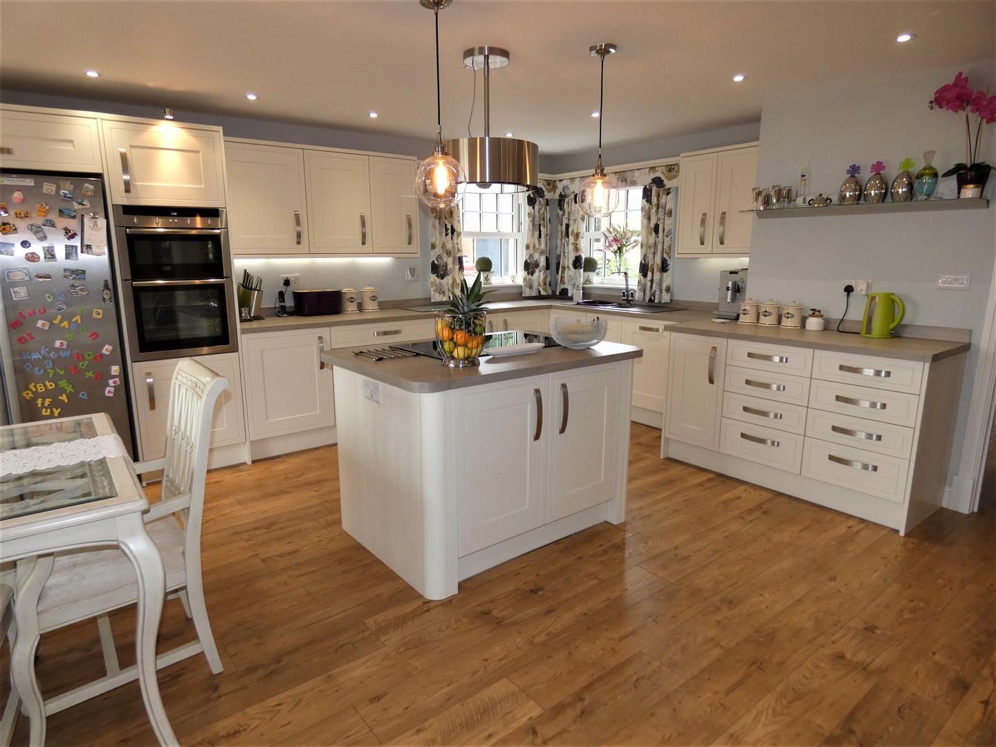 A modern recently bespoke detached family home. The property has been completed to a superior specification with gas fired underfloor heating, sash style UPVC double glazed windows, quality internal doors and a fabulous open plan dining kitchen. Upon inspection the home will reveal a fabulous reception hall with an oak detail staircase with galleried landing above, fitted cloakroom/W.C, an attractive rear elevation lounge with feature fireplace housing log burner opening into the spacious orangery with a further feature fireplace and French doors to the rear garden backing open fields. A living dining kitchen with quality fitted appliances with an adjacent utility room. Finishing the ground floor accommodation is the master bedroom suite with dressing area and a luxury en-suite bathroom. On the first floor landing you will find guest bedroom suite having an en-suite shower room, two further generous double bedrooms and a superb family bathroom. Outside is a double attached garage