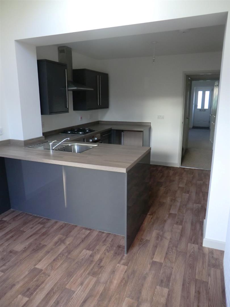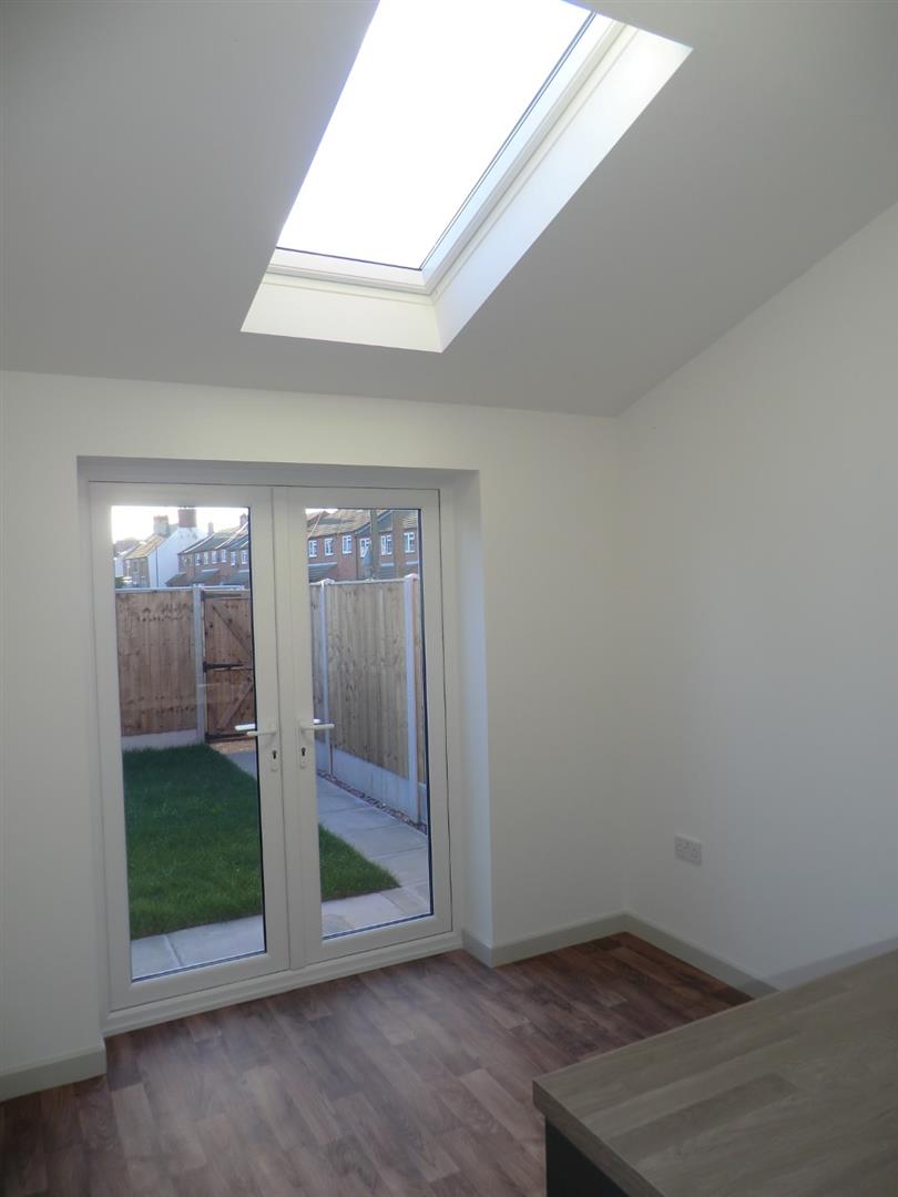 Fitted units with work surfaces and a breakfast bar. Fitted oven and hob, radiator, sky light window and double doors onto the garden.