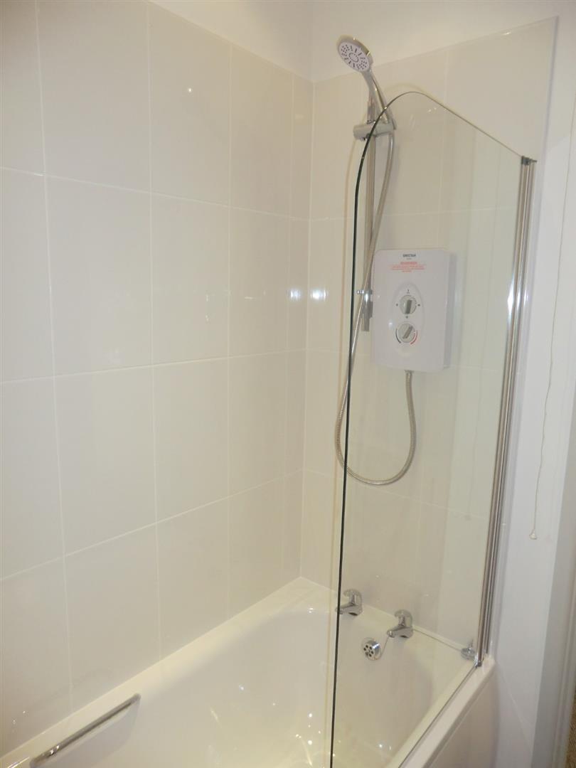Panel enclosed bath with shower and shower screen, low flush wc, wash hand basin and radiator.