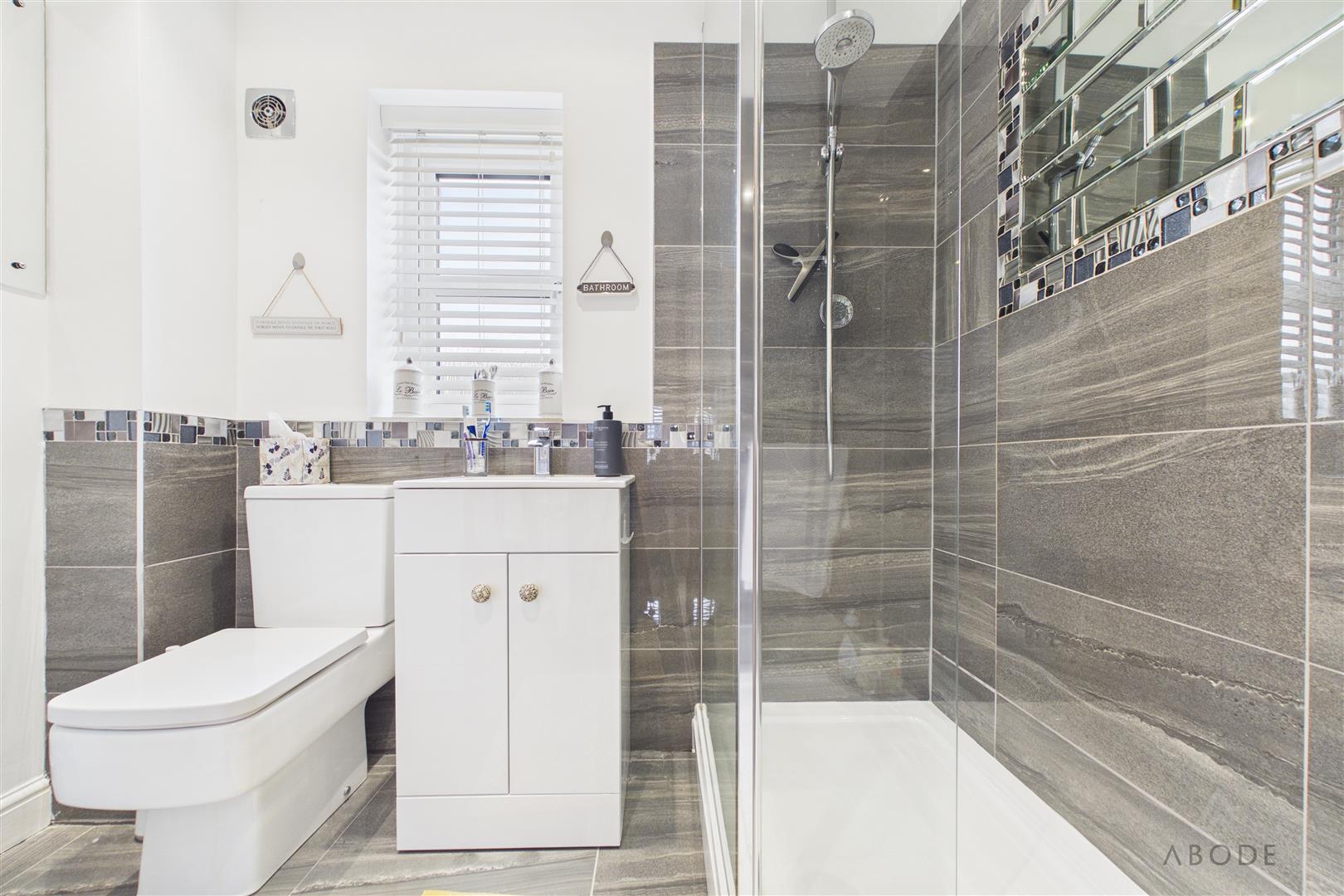 The family shower room is fitted with a contemporary three-piece suite, including a a walk in shower, wash hand basin and WC, finished with tiled flooring and walls.