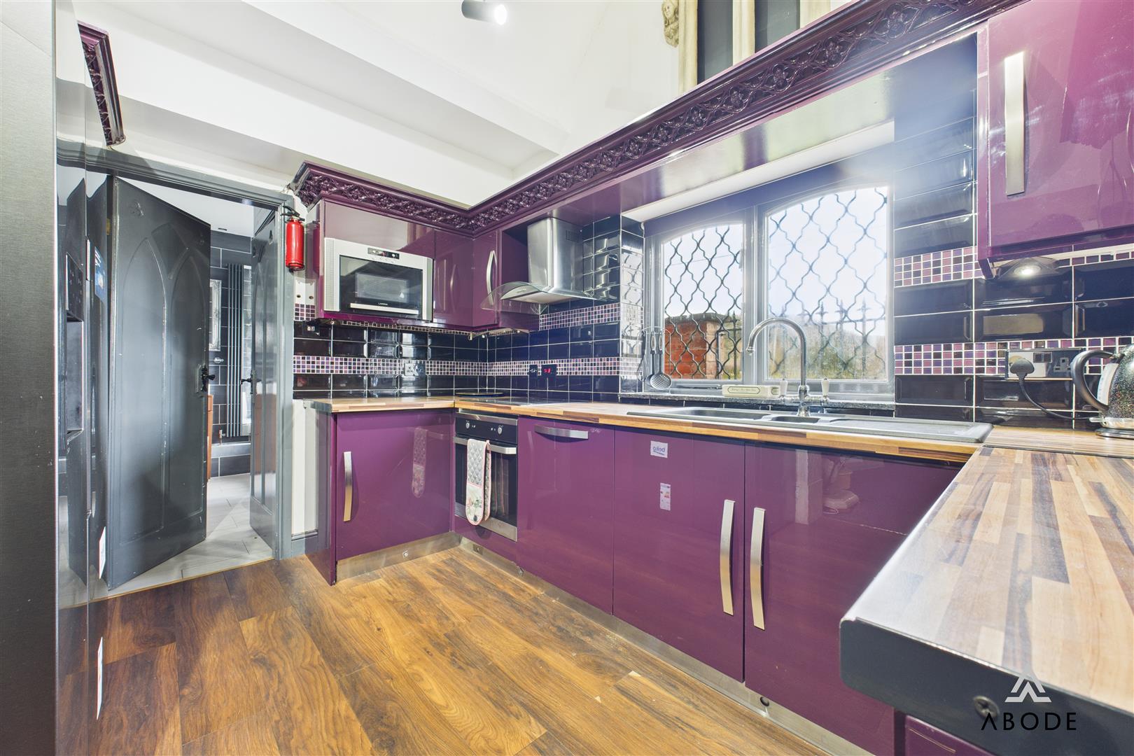 A well-appointed and contemporary kitchen, finished with laminate flooring throughout and offering a comprehensive range of matching base, wall and drawer units topped with wood-block-effect…