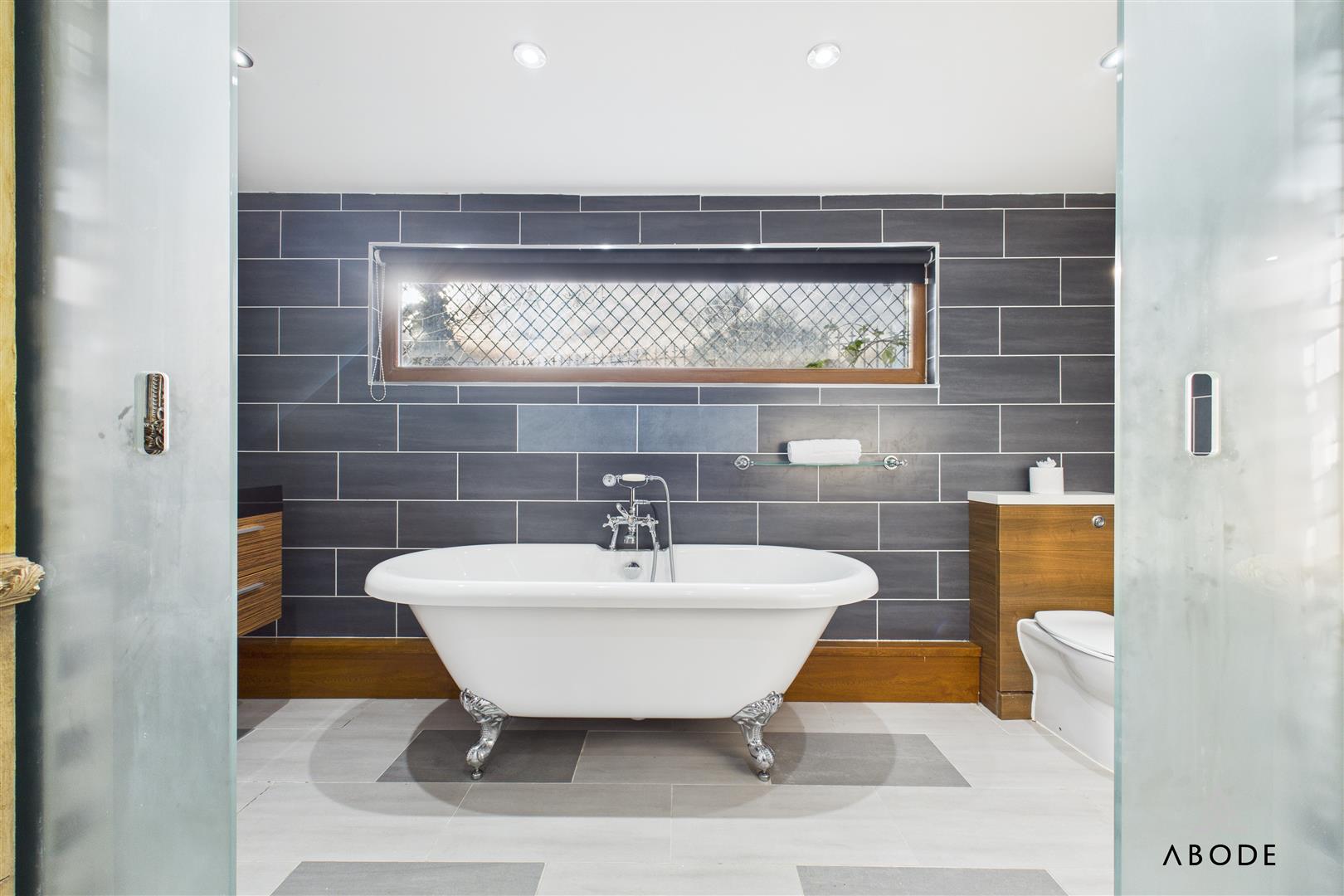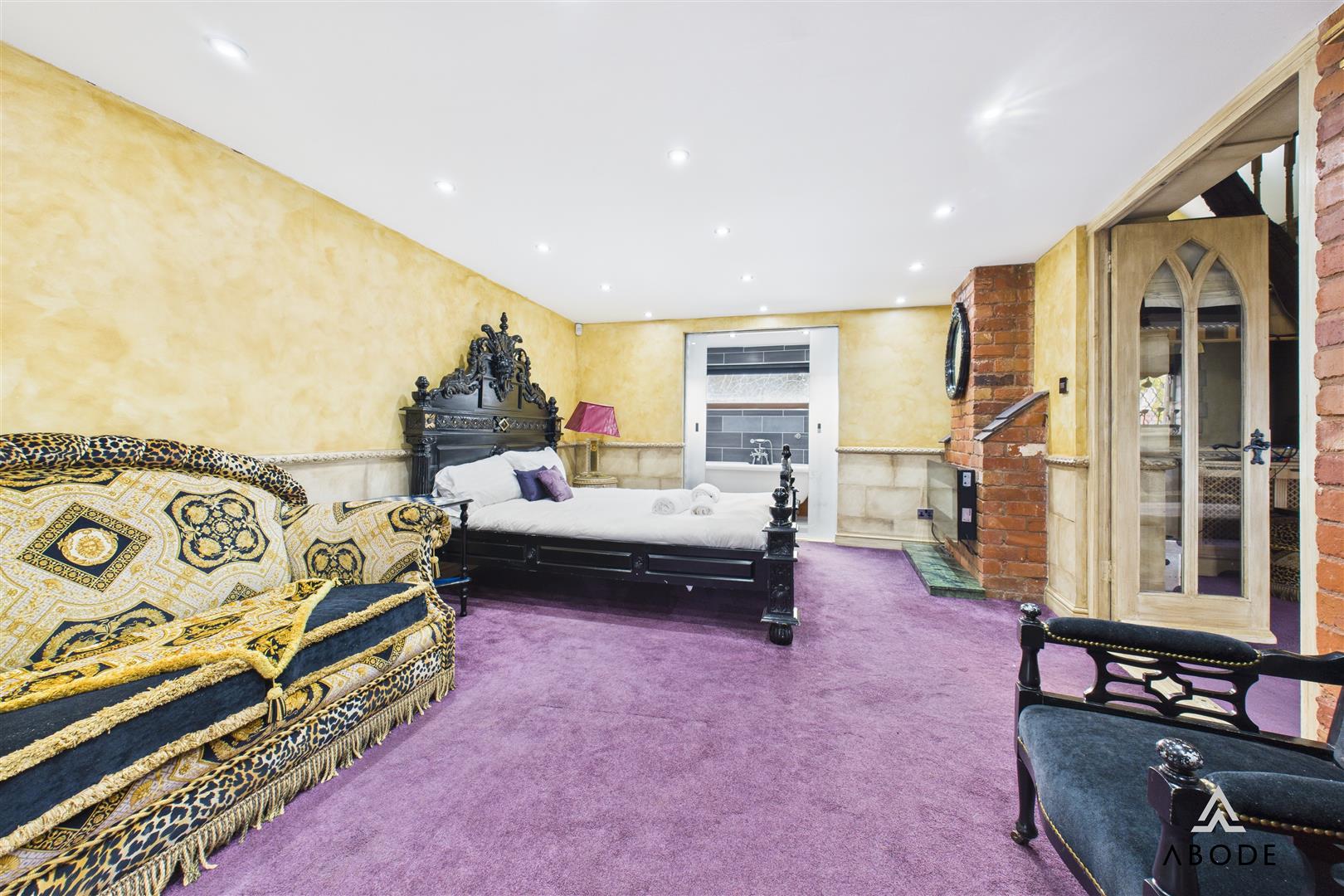 Internally, the accommodation is both well-appointed and thoughtfully arranged. The contemporary kitchen is comprehensively fitted with a range of units and integrated appliances, enjoying open views across neighbouring fields. Living space is centred around an impressive Gothic-inspired lounge with a feature fireplace and exposed architectural elements. The property offers well-proportioned bedrooms, including a standout master bedroom with French doors and a luxurious en-suite featuring a roll-top bath.