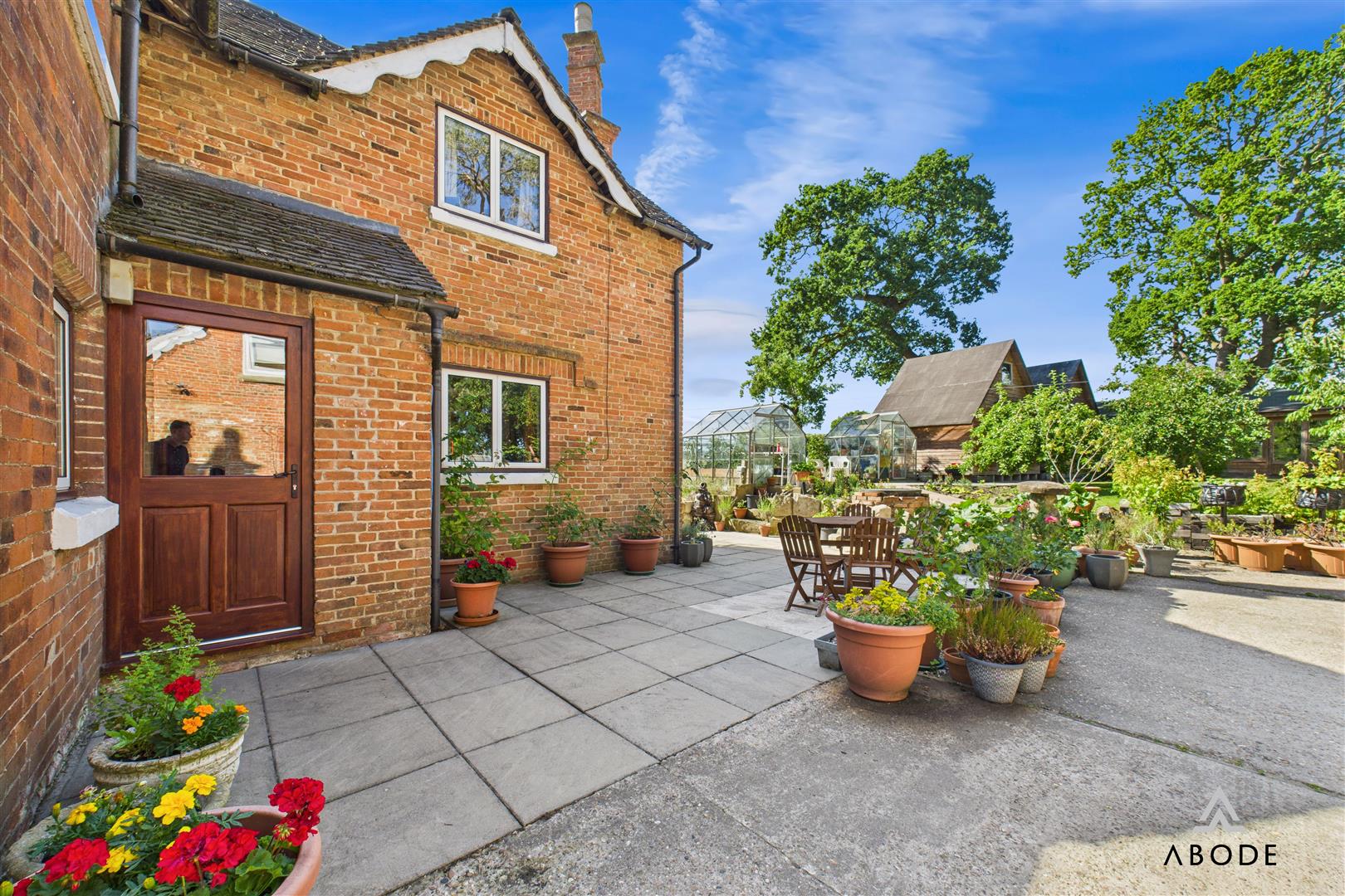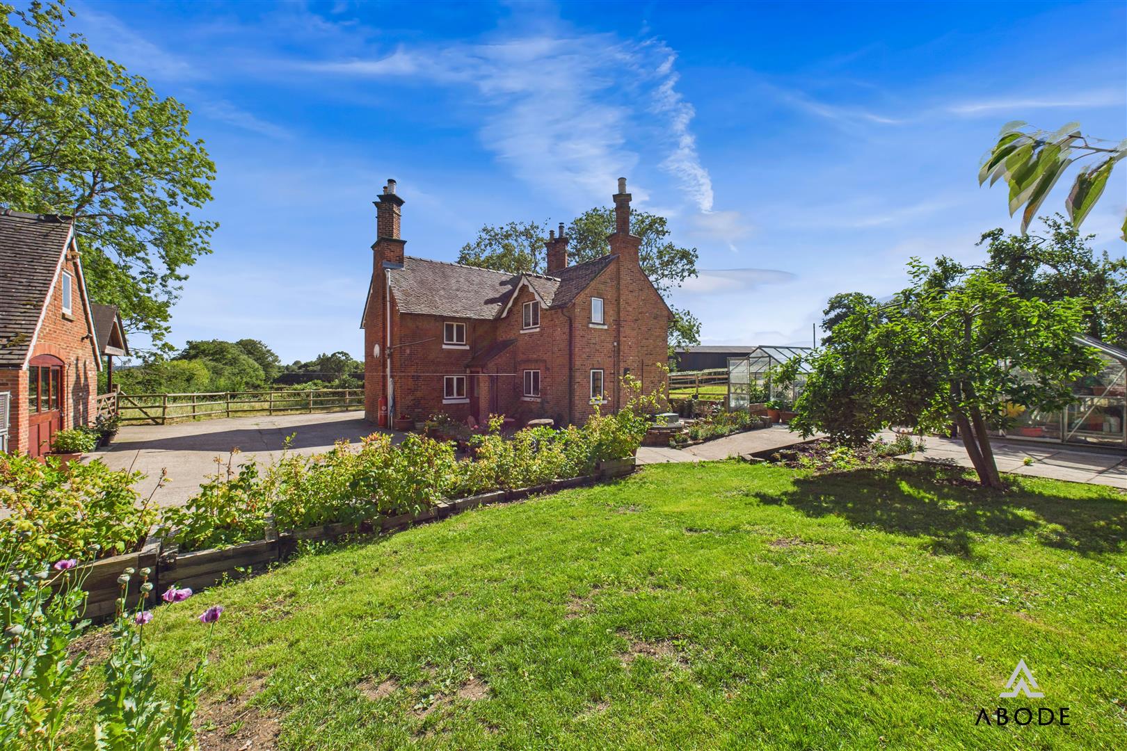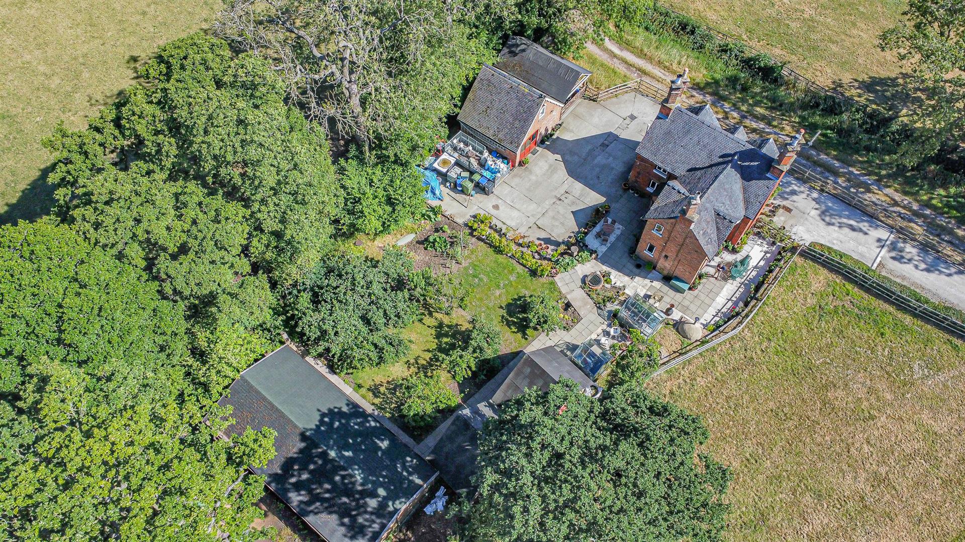 Approached via a private drive, the house is framed by established gardens offering sweeping views of the surrounding countryside. The grounds are thoughtfully landscaped, with formal lawned areas, mature planting, and a dedicated patio zone perfect for entertaining. A brick-built pizza oven adds rustic charm, while the kitchen garden features fruit trees and two greenhouses.