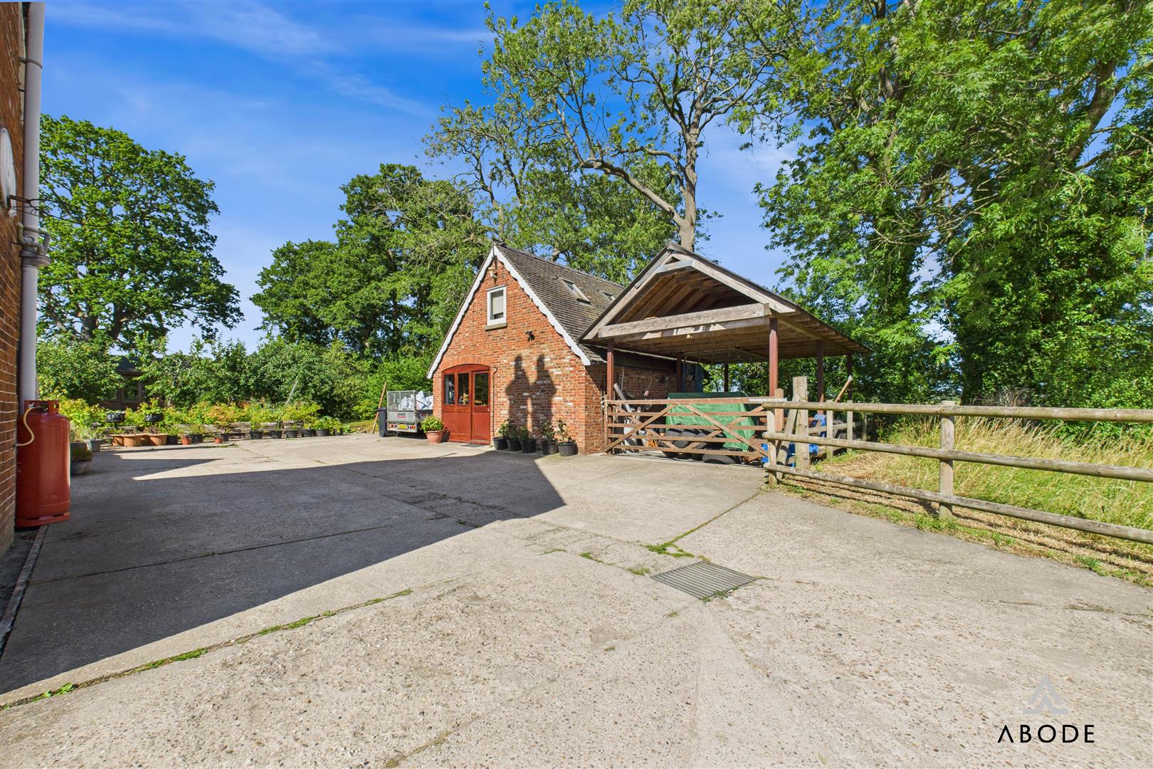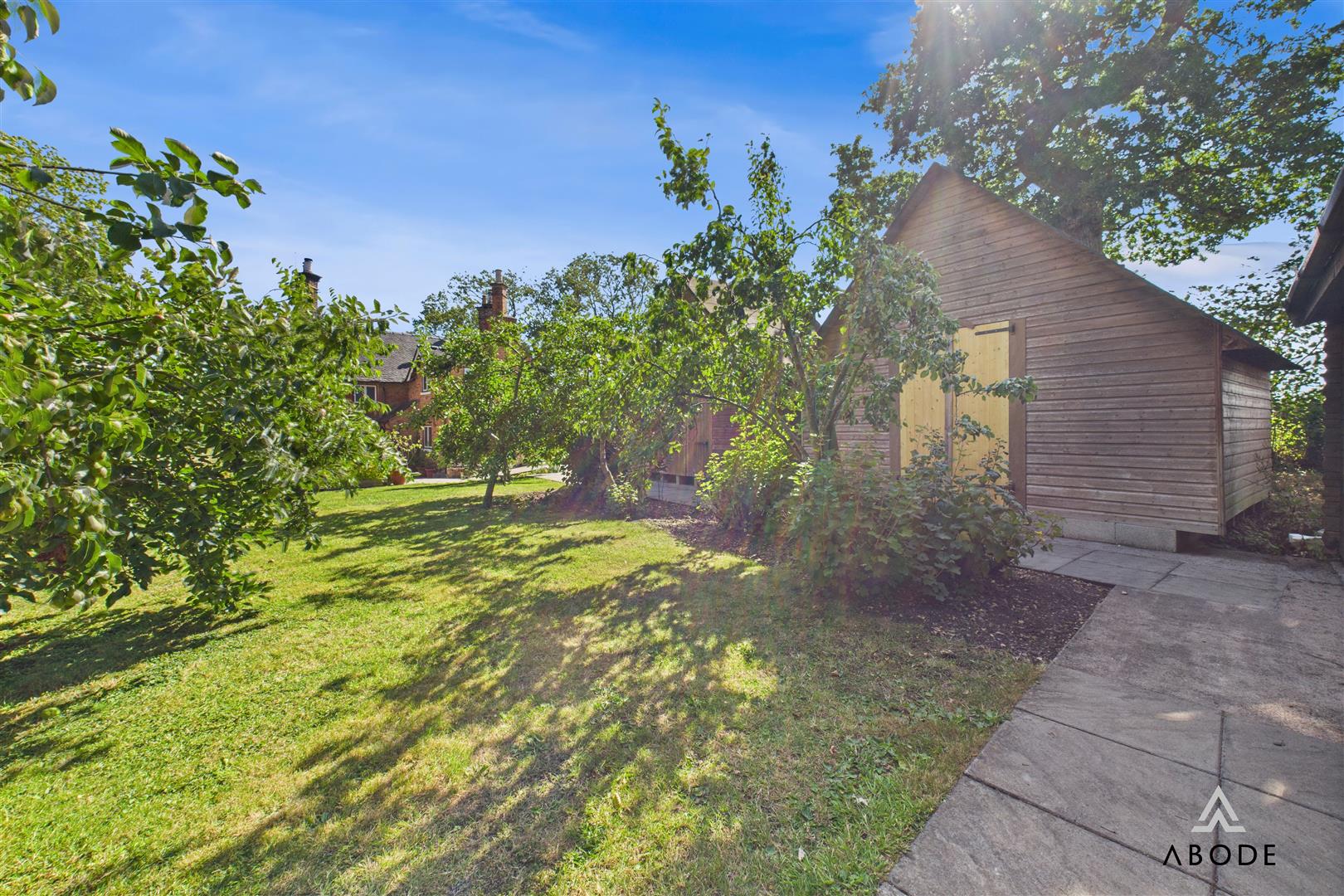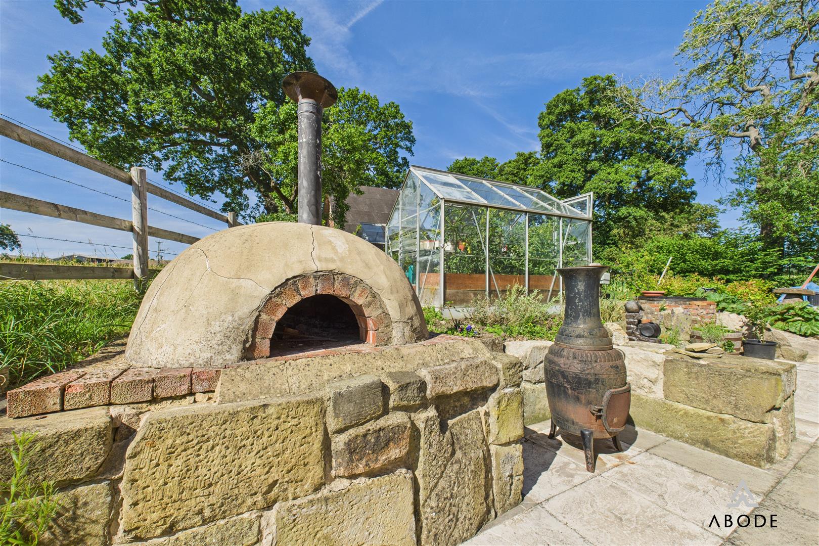 Approached via a private drive, the house is framed by established gardens offering sweeping views of the surrounding countryside. The grounds are thoughtfully landscaped, with formal lawned areas, mature planting, and a dedicated patio zone perfect for entertaining. A brick-built pizza oven adds rustic charm, while the kitchen garden features fruit trees and two greenhouses.