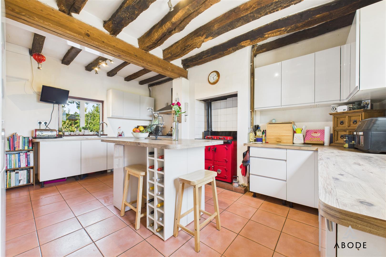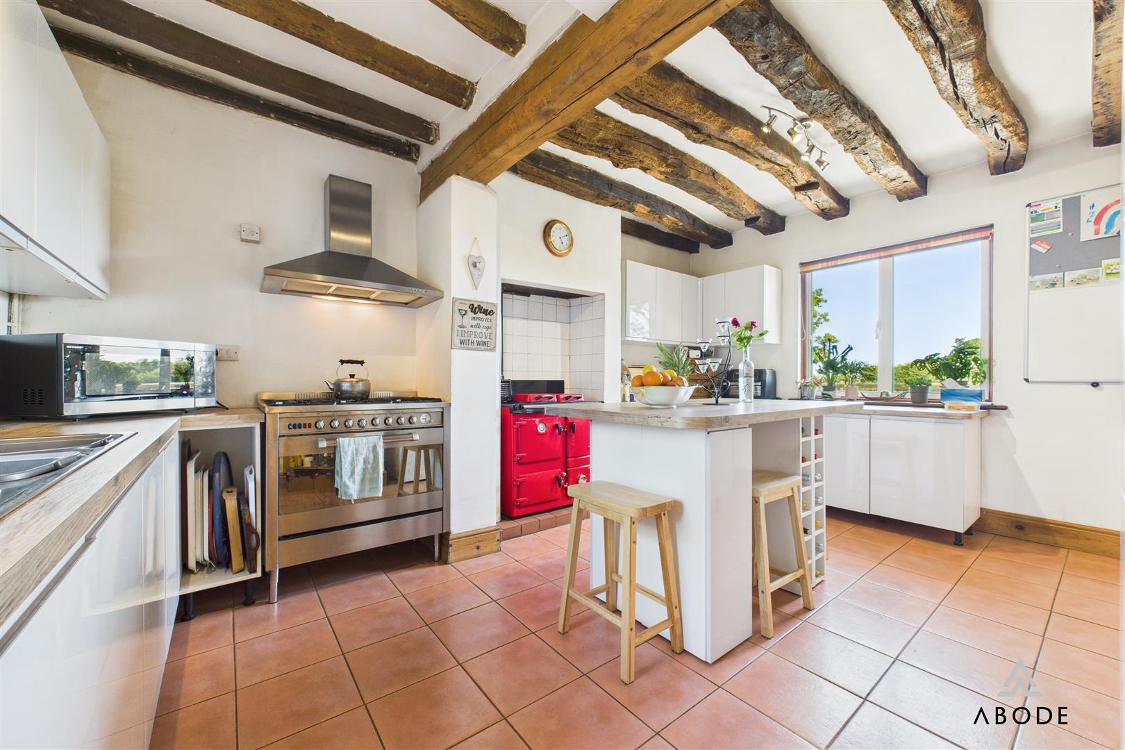 Thoughtfully designed with a comprehensive range of units and drawers, a central island with breakfast bar overhang, and ample storage. Appliances include a wood-fired Rayburn (for hot water and heating), and a separate electric range-style cooker with six-ring LPG hob. There is space for an American style fridge/freezer. Windows to both front and rear elevations allow excellent natural light.