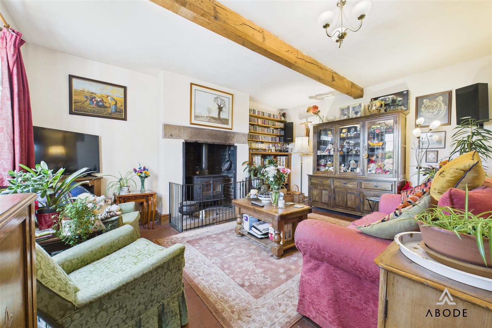 A beautifully presented reception room with a double glazed window to the front elevation and central heating radiator. The focal point is a cast iron log burning fireplace with stone mantle, exposed brick backing and hearth. Exposed timber beamwork to the ceiling enhances the character.