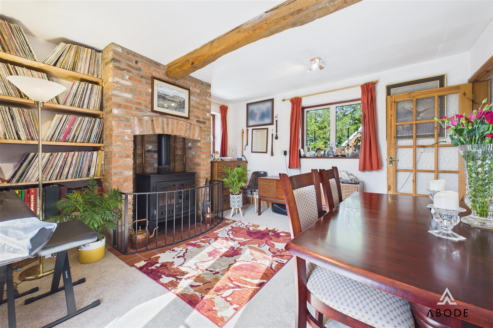 A generous space ideal for entertaining, with two double glazed windows to the rear and side, as well as double glazed French doors opening onto the patio. The room features a cast iron log burner with back boiler having an exposed brick surround, tiled hearth, and exposed ceiling beams.