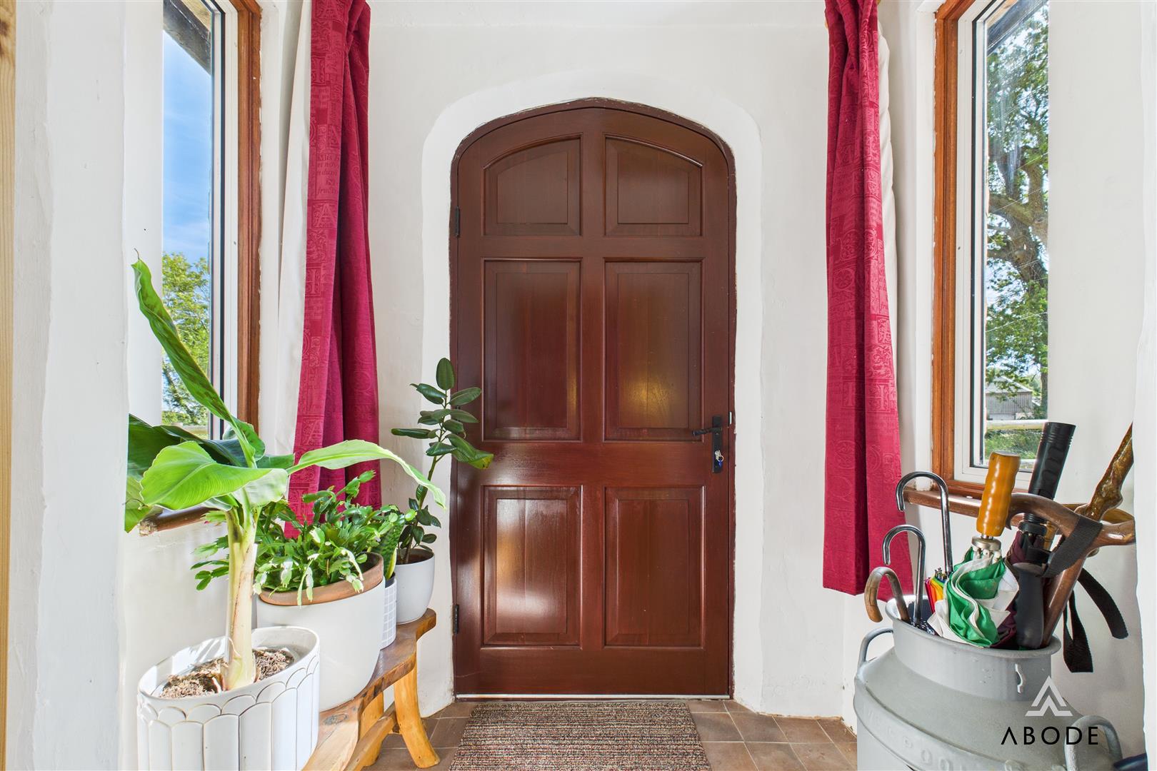 A timber front entry door leads into a welcoming entrance hall with two double glazed windows to the side elevations. An open archway connects through to the main lounge.
