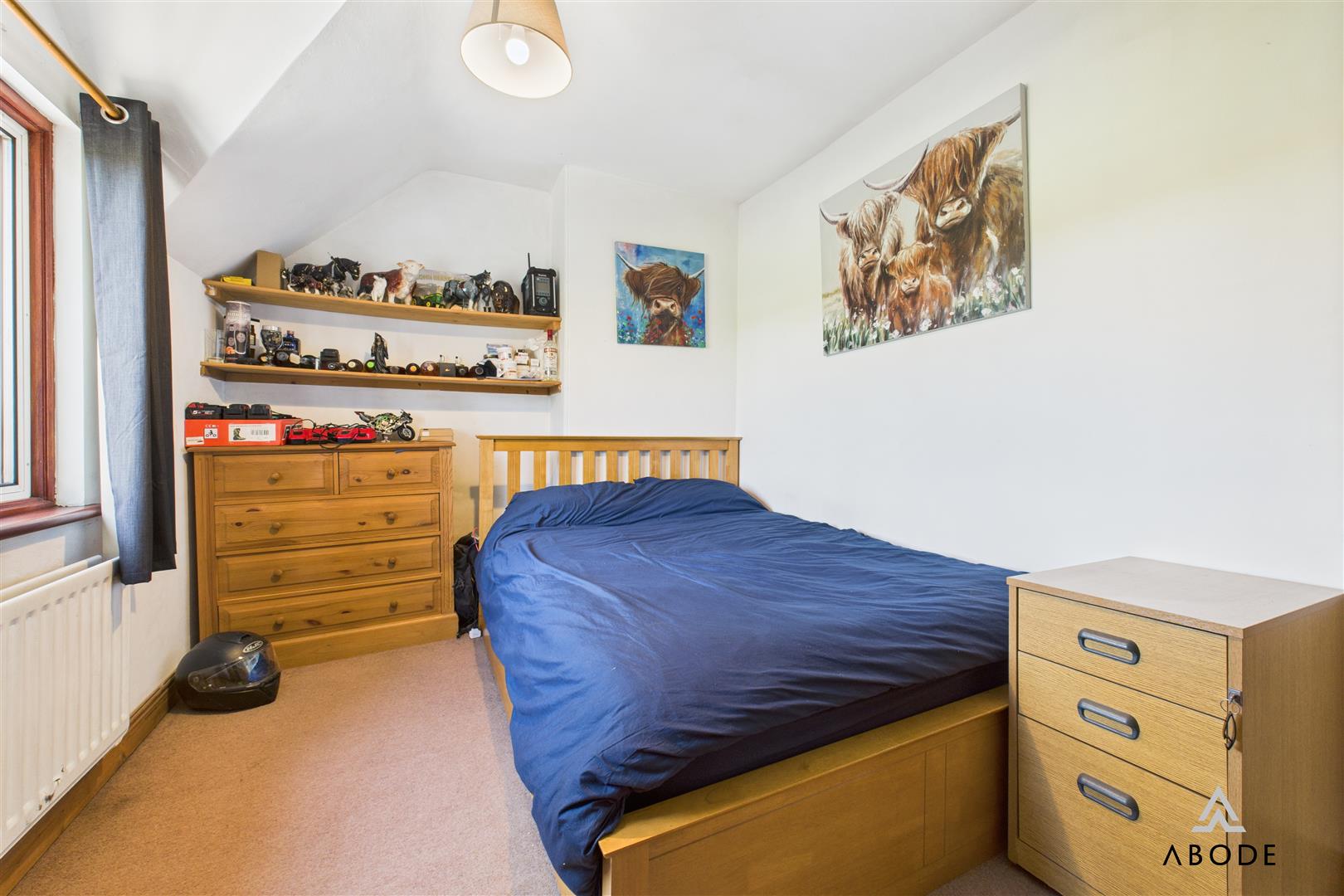 With a double glazed window overlooking fields, a central heating radiator, and an over-stairs storage cupboard.