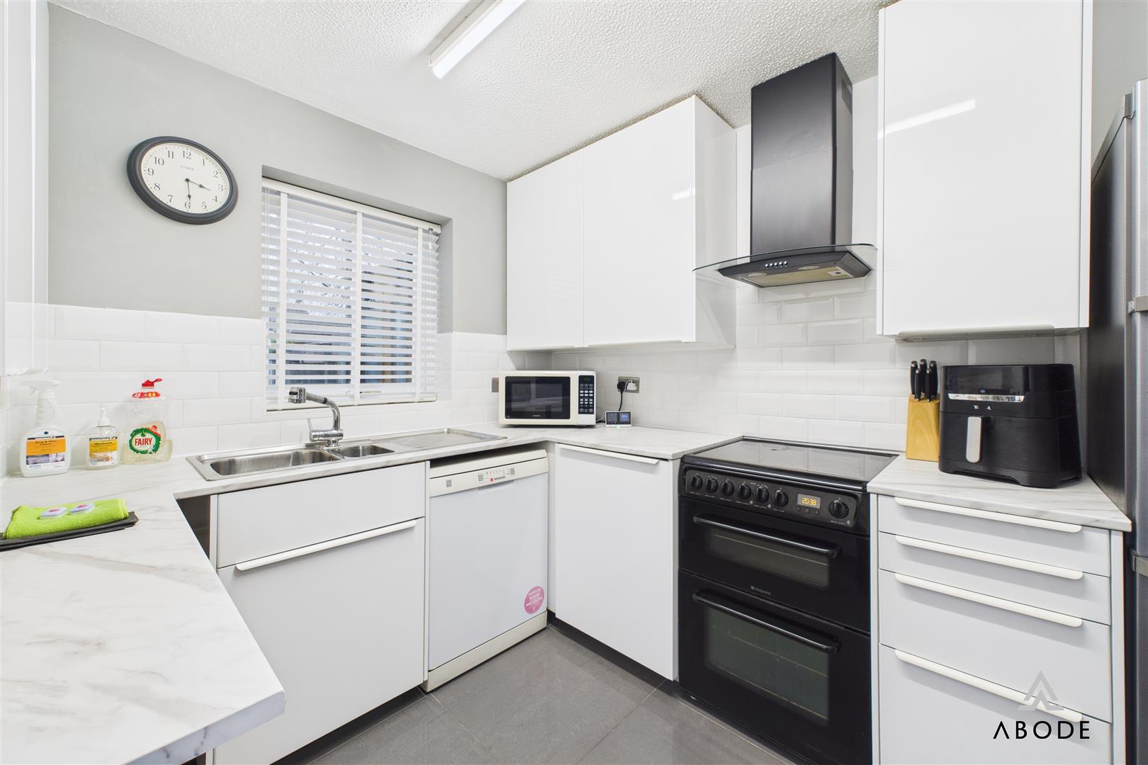 The kitchen is positioned to the rear, fitted with sleek high-gloss wall and base units, marble-effect work surfaces, tiled splash backs, integrated sink, space for appliances, and a window overlooking the garden.