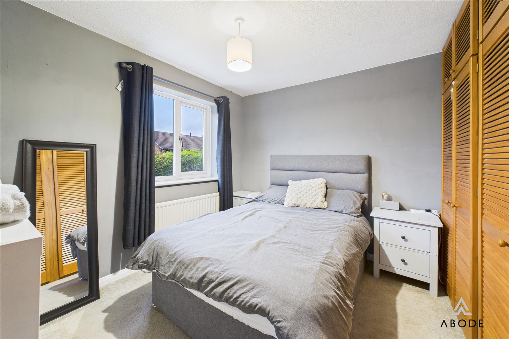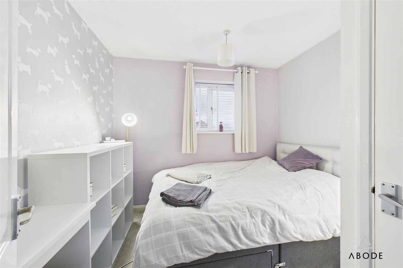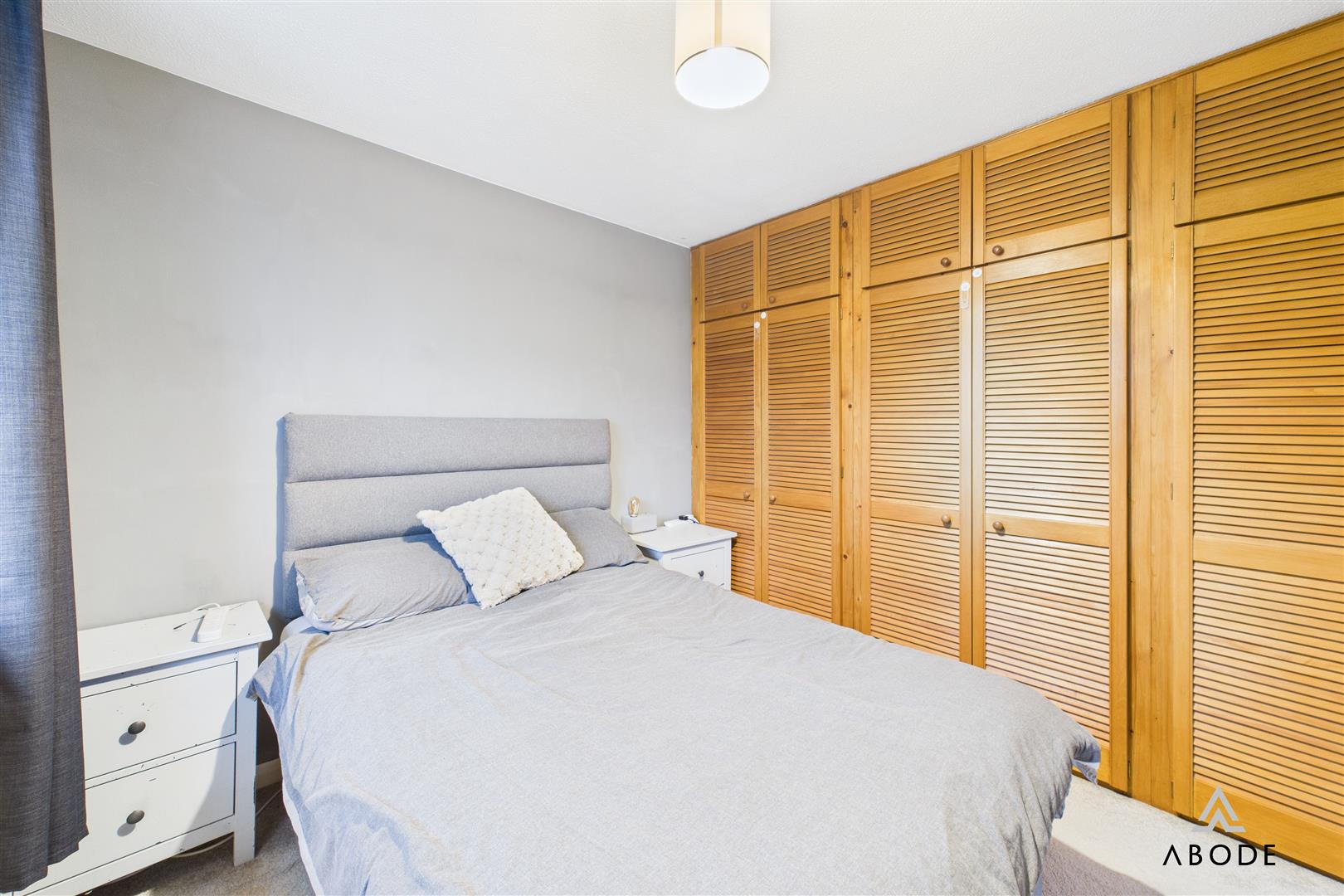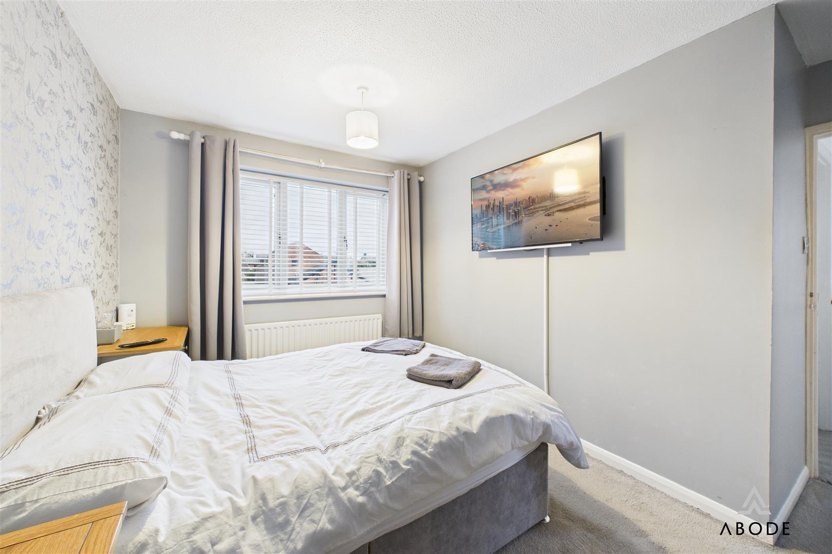 The master bedroom is a generous double room with a wide front-facing window and extensive fitted wardrobes spanning one wall. Bedroom two is another good double with fitted storage, while bedroom three is a well-proportioned single or small double overlooking the rear garden.