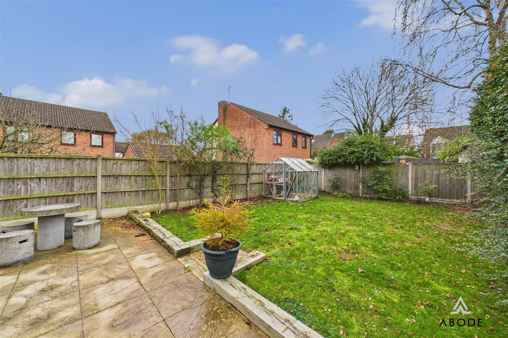 The enclosed rear garden is a generous size, offering a lawned area, established borders, a patio for outdoor seating, and space for a greenhouse. The garden enjoys good privacy, making it ideal for families or those who enjoy outdoor living.