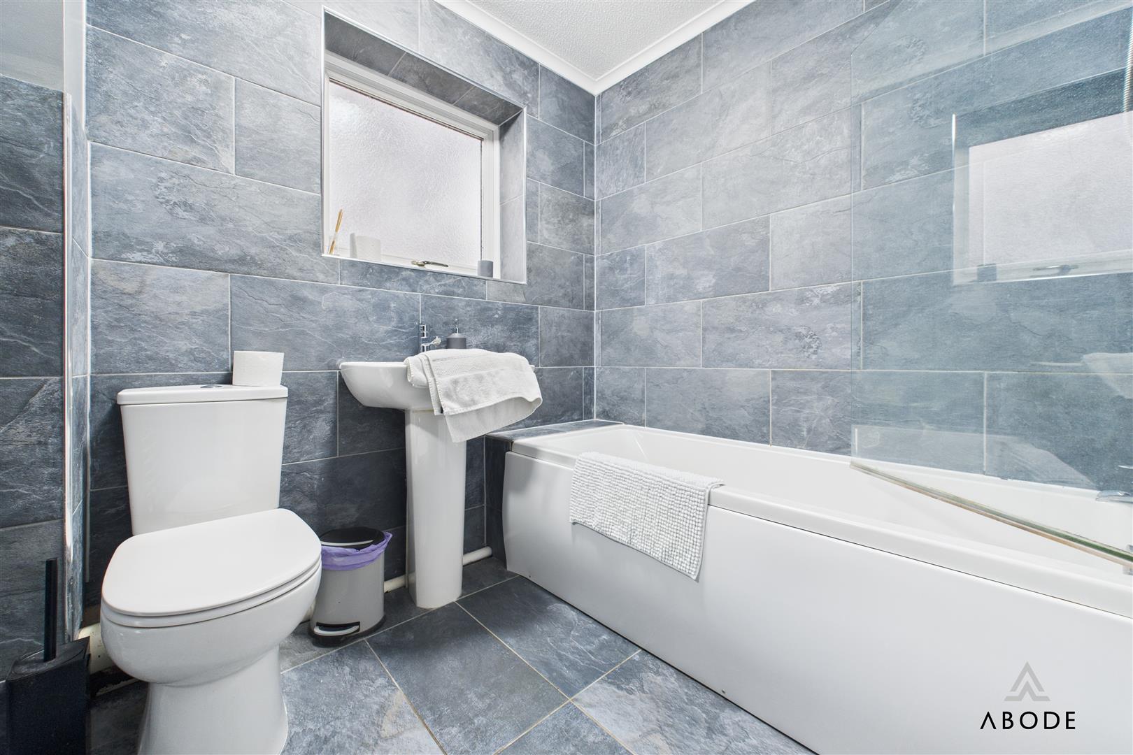 The contemporary family bathroom is finished to a high standard, offering a modern three-piece suite including a panelled bath with shower over, wash hand basin, low-level WC, tiled walls, and a double-glazed window with privacy glass.