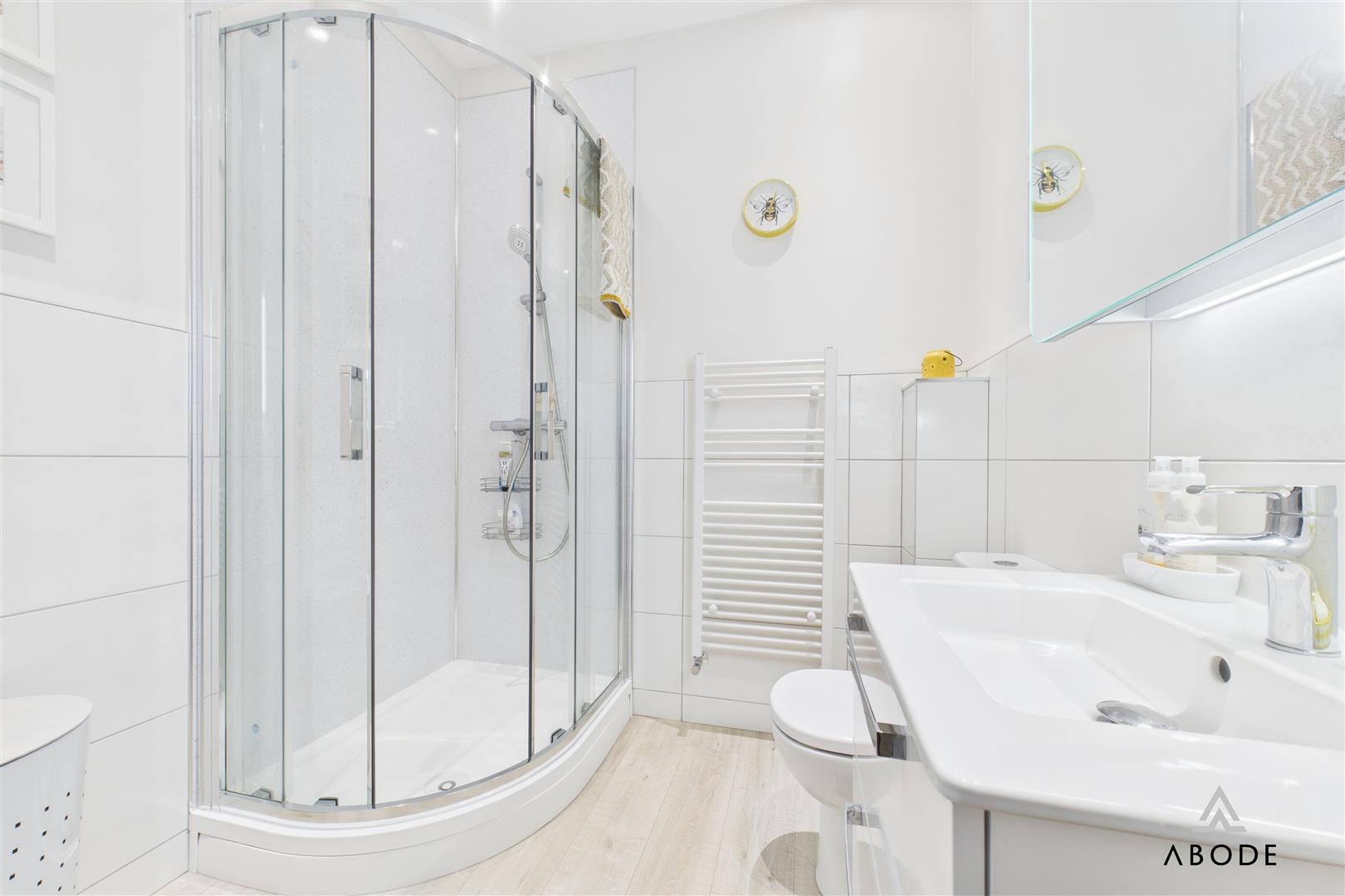 The second-floor landing leads to three generously sized bedrooms. The principal bedroom benefits from dual front-facing windows, while the additional bedrooms all feature central-heating radiators and uPVC double-glazed windows. A contemporary family shower room includes a corner shower cubicle, vanity wash hand basin, low-level WC, heated towel radiator and stylish wall and floor tiling.