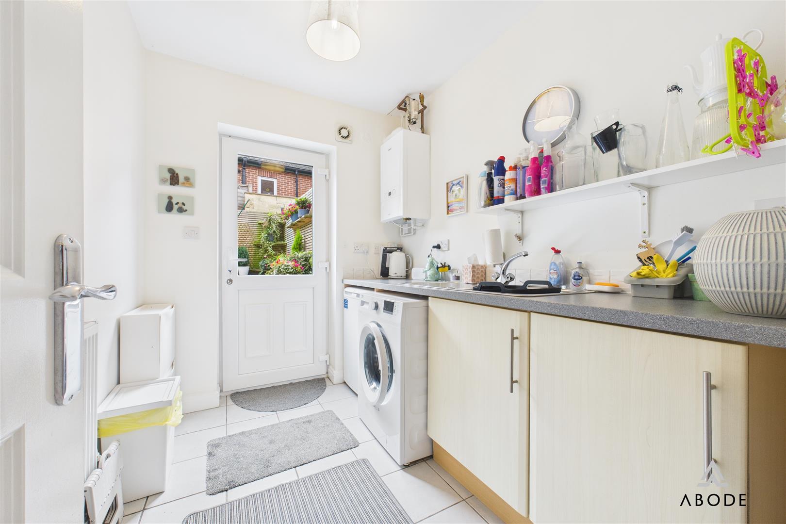 The ground floor features a welcoming entrance hall with cloakroom/WC, useful under-stairs storage and a well-equipped utility room with space for appliances. A garage with electric roller door is also accessible at this level.