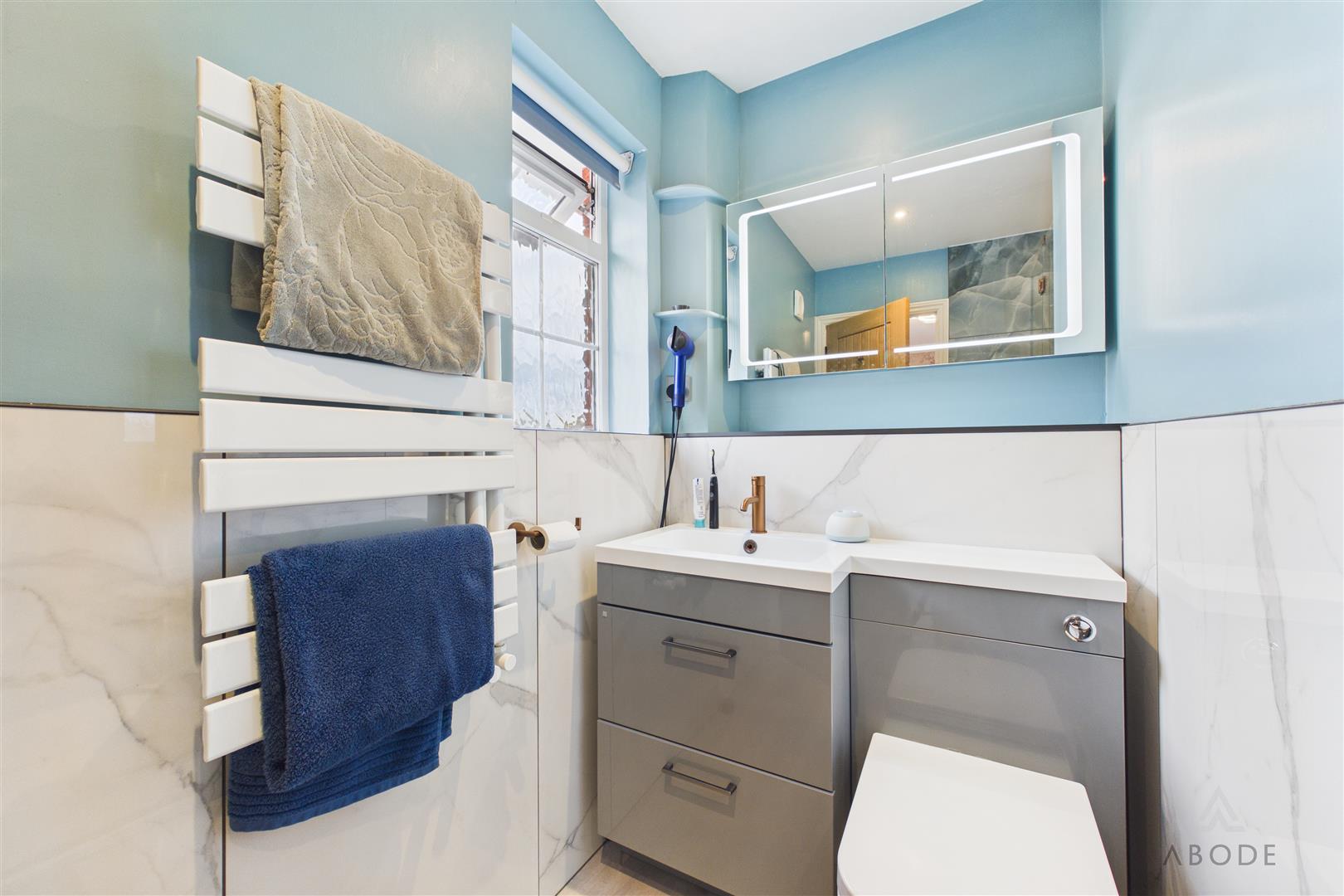 Appointed with a low-level WC and a contemporary corner floating wash hand basin with complementary tiling to both floor and part walls. Additional features include a central heating radiator and extractor fan.