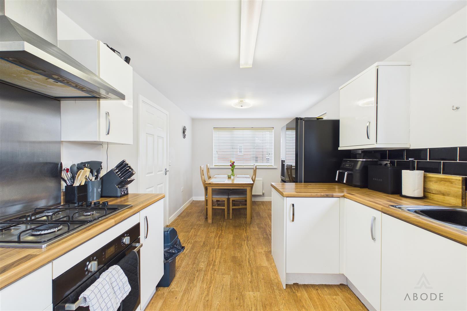 To the rear of the property, the open-plan kitchen diner provides a functional and sociable space. The kitchen is fitted with a range of matching wall and base units with work surfaces over, incorporating an integrated oven, gas hob with extractor above, and space for additional appliances. A door provides access to the side driveway, while the dining area benefits from windows to the front and side aspects.