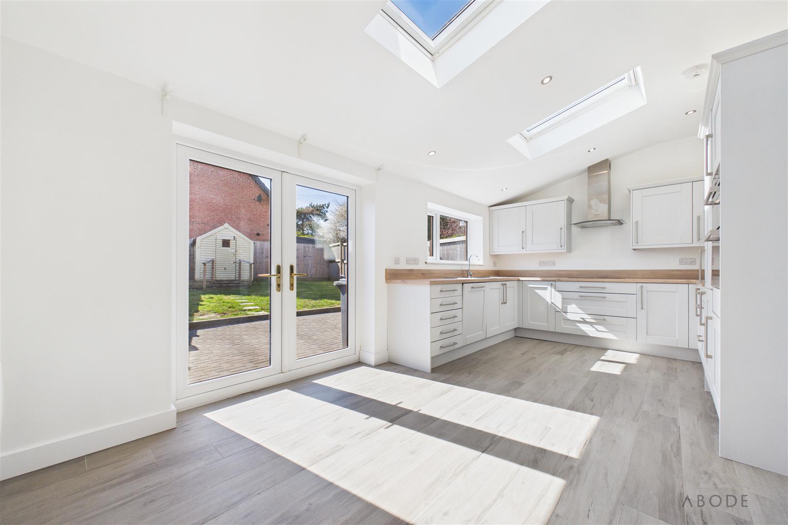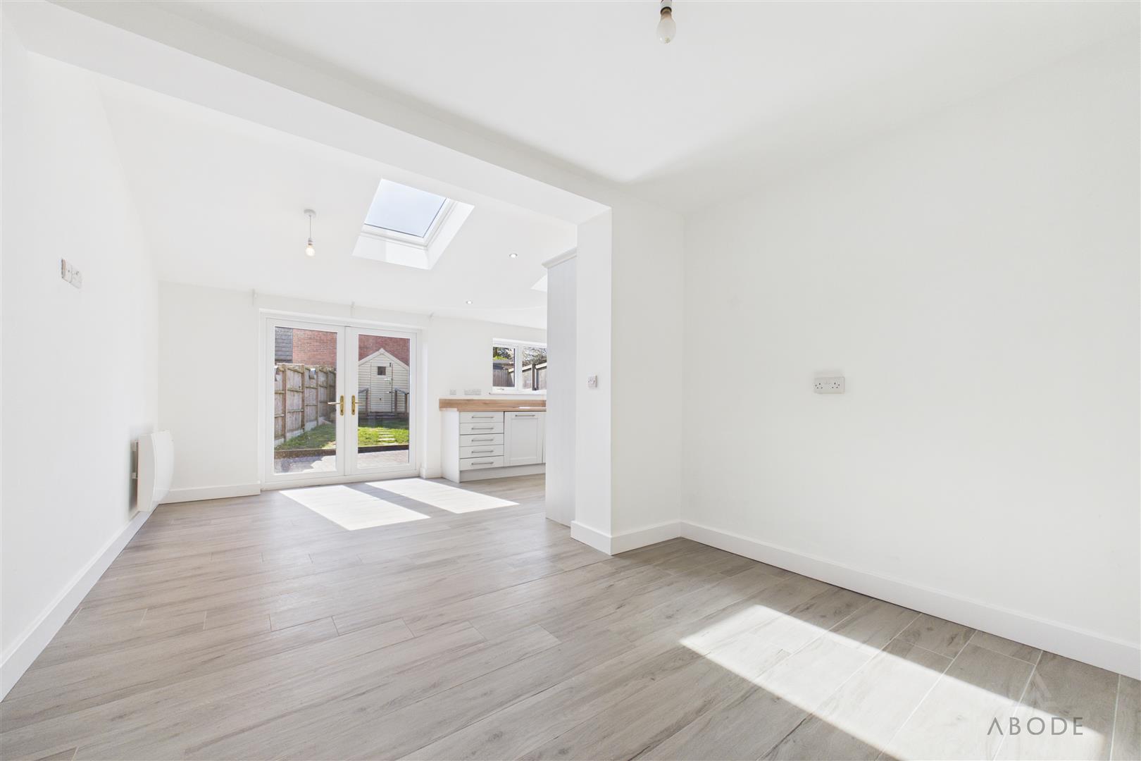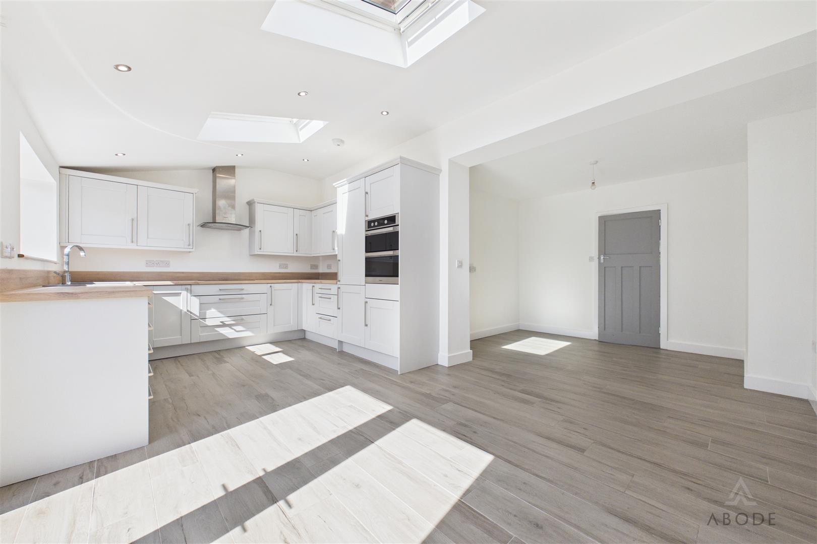 To the rear, there is a modern open-plan kitchen/dining area with integrated appliances and French doors opening onto the garden, creating an ideal space for entertaining.