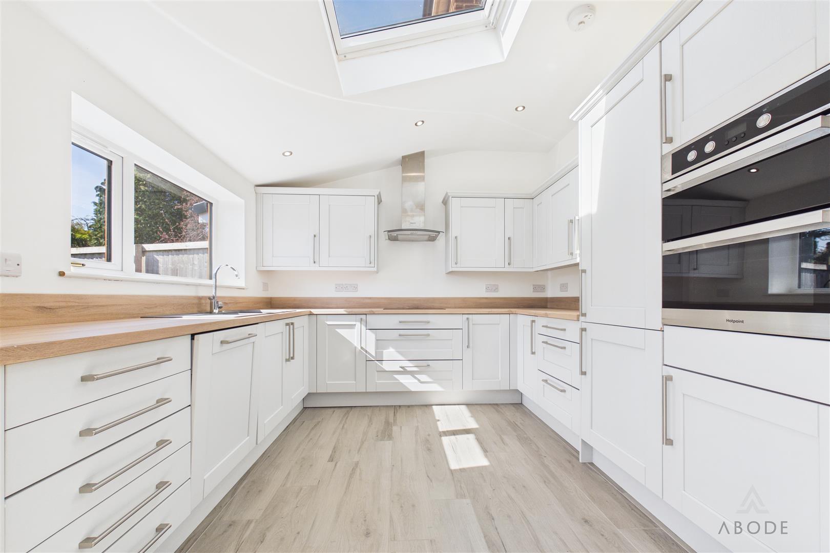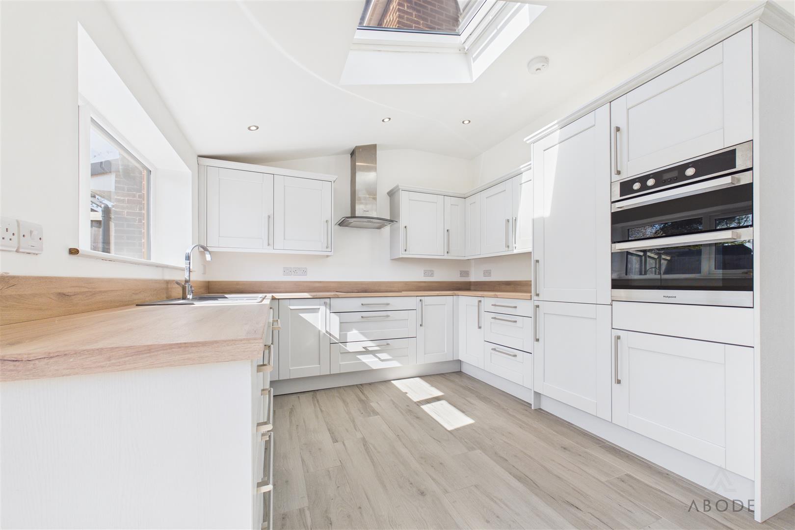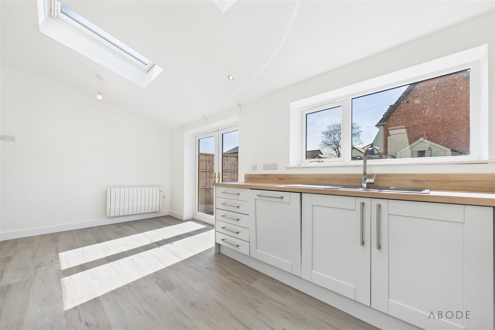 To the rear, there is a modern open-plan kitchen/dining area with integrated appliances and French doors opening onto the garden, creating an ideal space for entertaining.