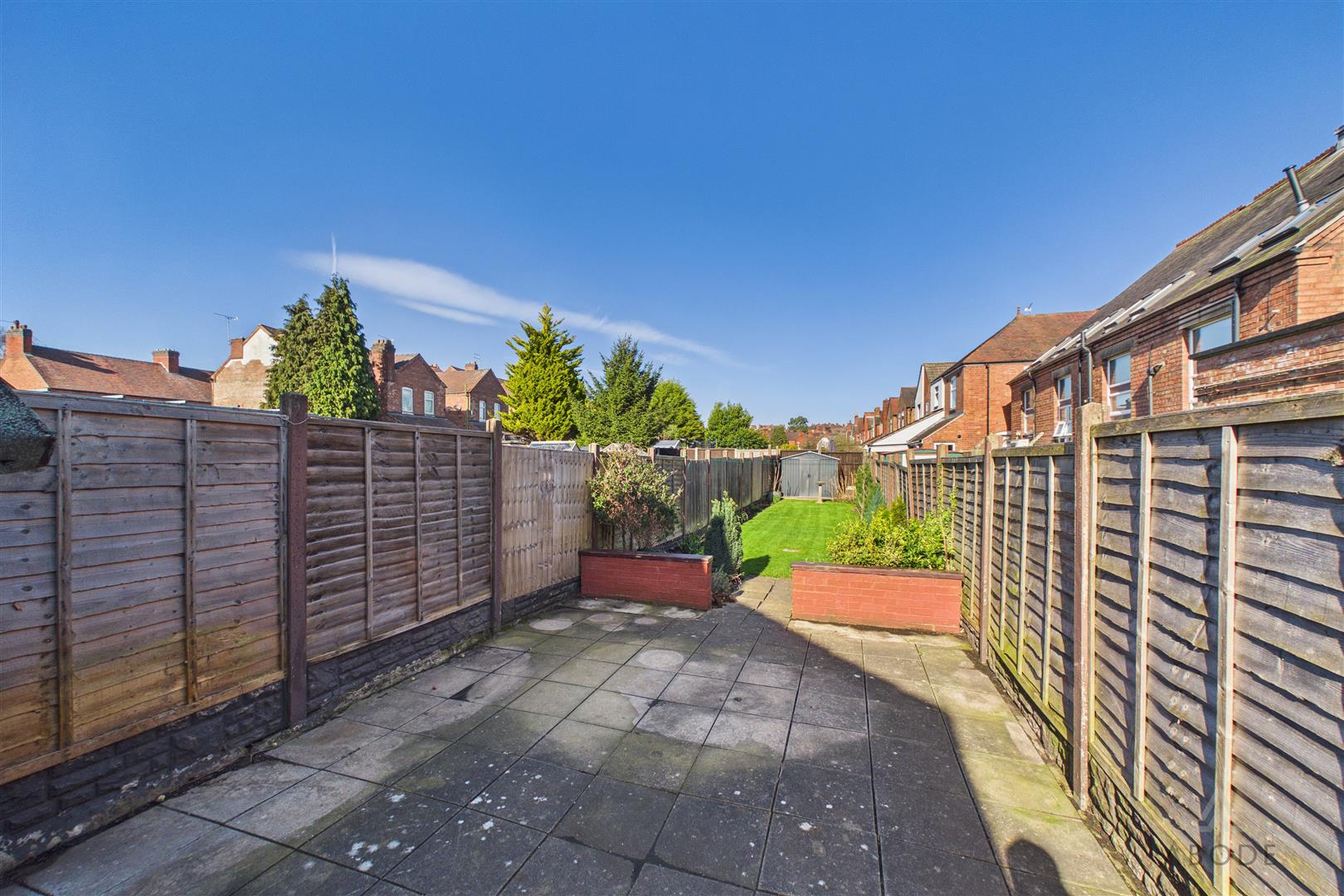 To the rear is an enclosed garden featuring a paved patio area directly off the property, leading to a lawn with planted borders and a garden shed positioned to the rear. The garden is enclosed by timber fencing.