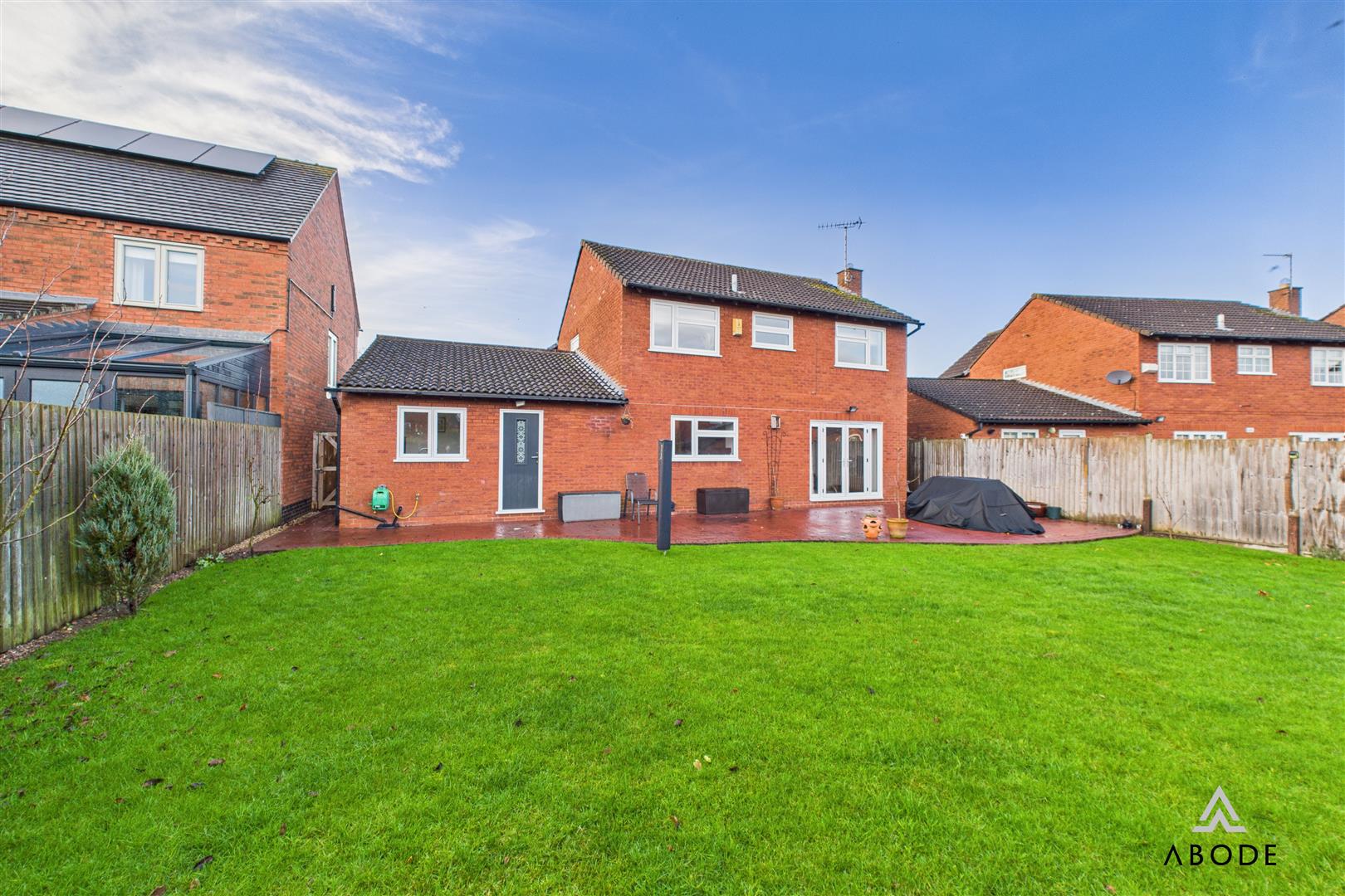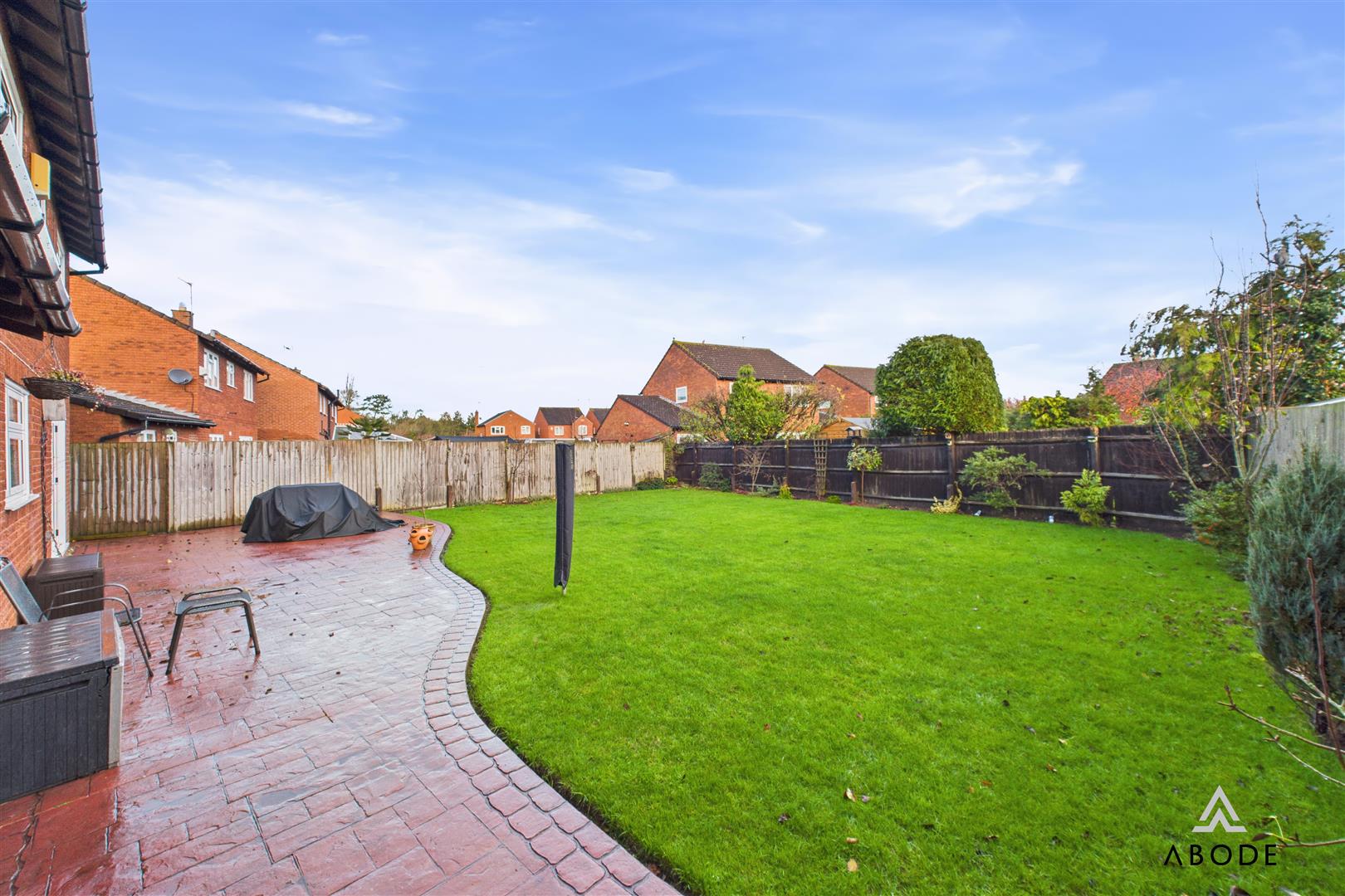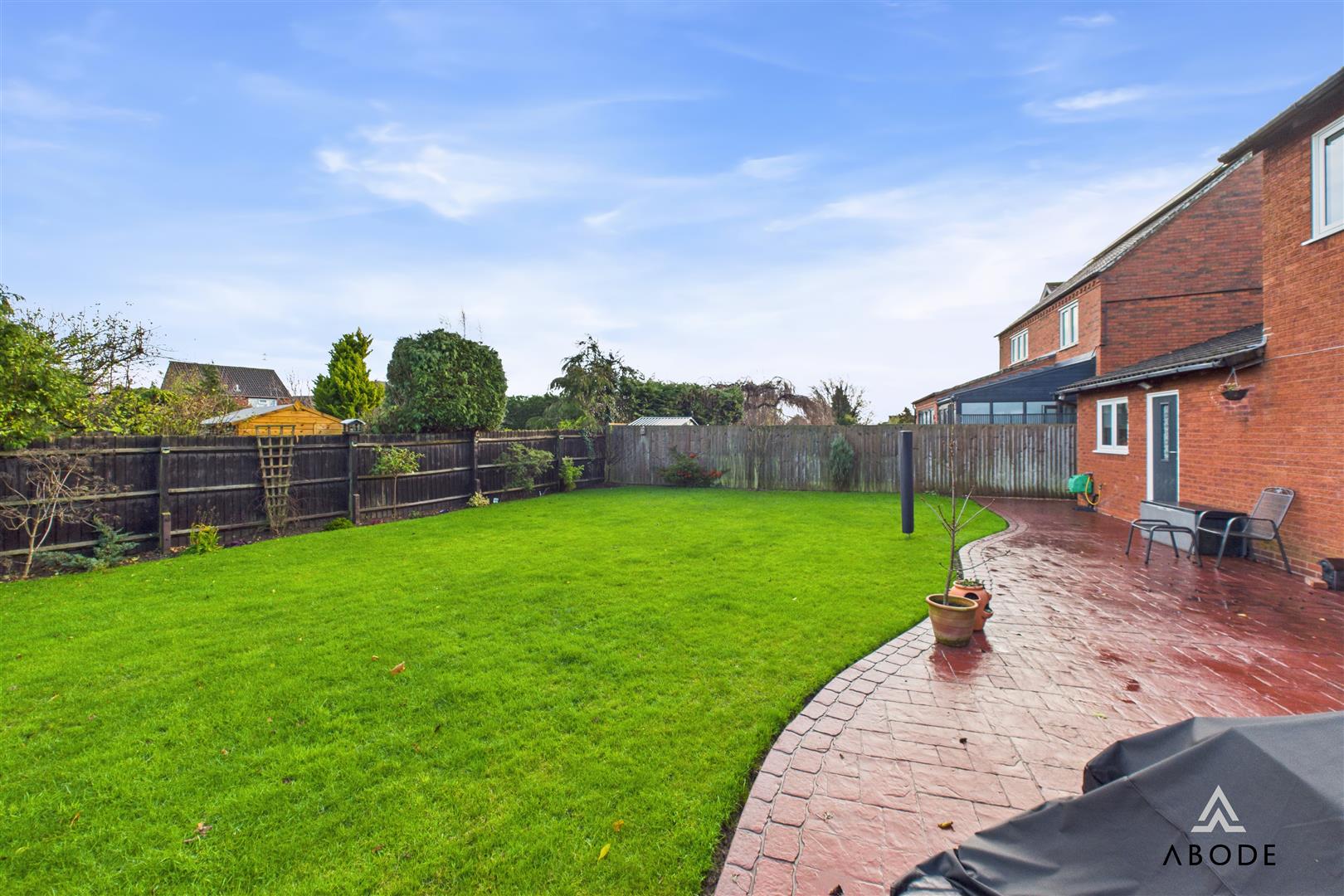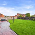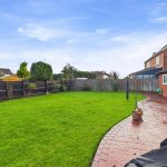 The rear garden is a true highlight – a substantial enclosed space with a sweeping lawn and a large stamped-concrete patio spanning the rear of the house. It offers superb space for outdoor dining, relaxing and family use, with plenty of potential for landscaping, play areas or garden structures.