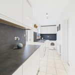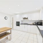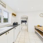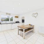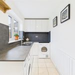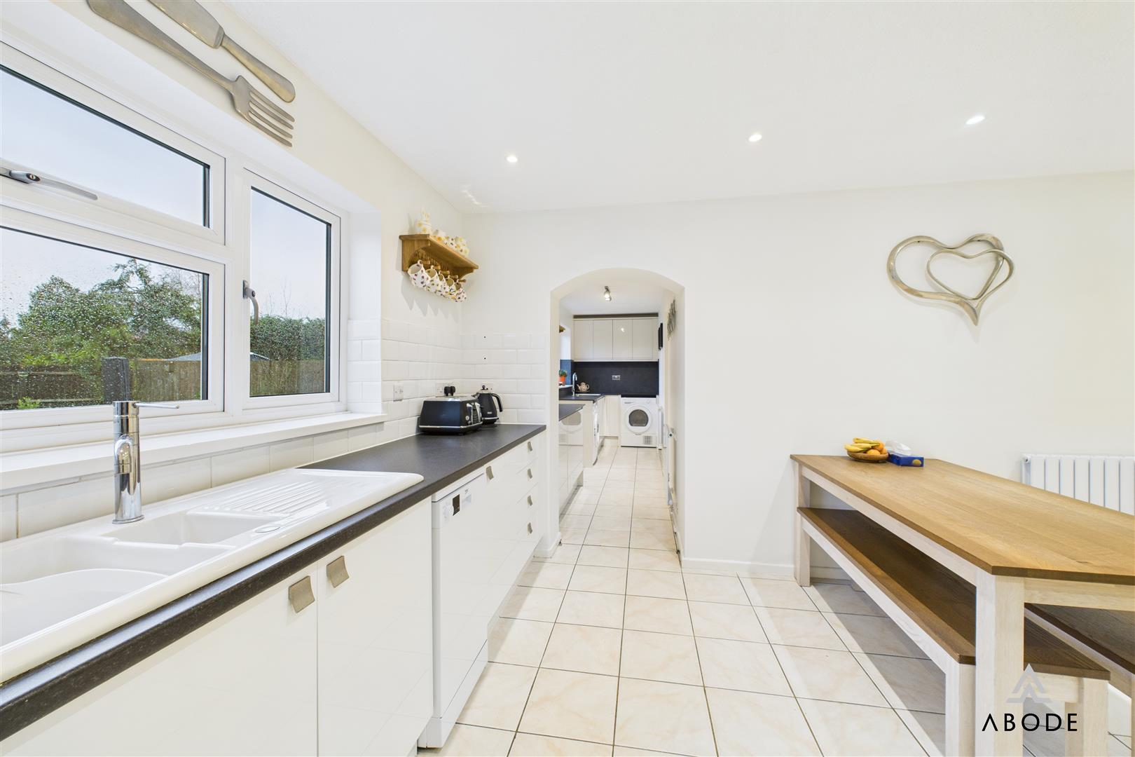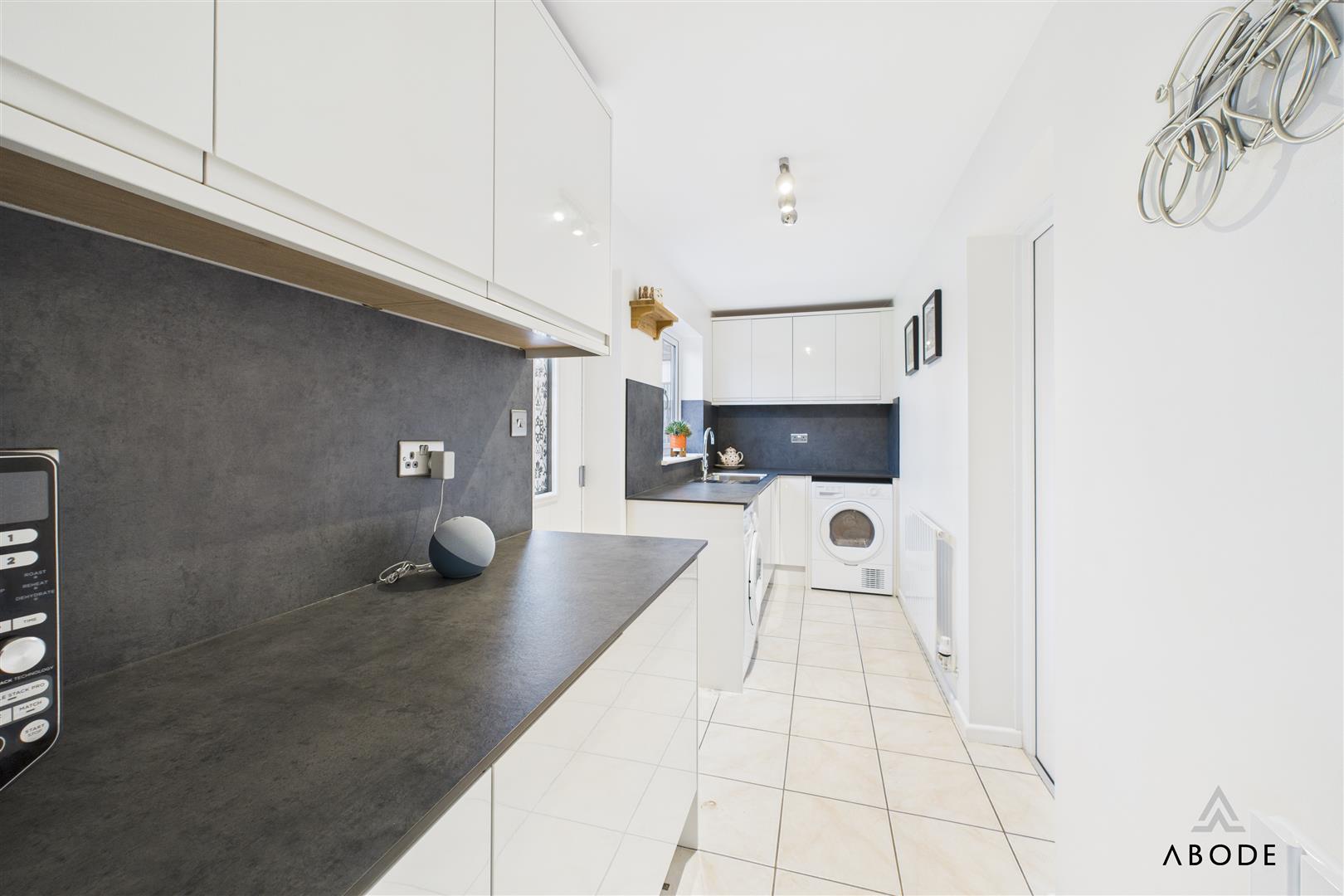 The kitchen, positioned to the rear elevation and is well fitted with modern white units, integrated appliances, tiled flooring and ample worktop space. There is room for a dining table, creating a sociable setting for everyday meals. An archway leads through to the extended utility room, offering additional storage units, worktops and appliance space, with a rear door giving direct access to the garden.