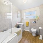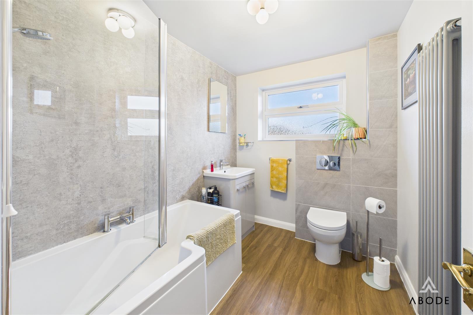The family bathroom has been stylishly refitted with a modern suite comprising a P-shaped bath with shower over, wash basin with vanity storage, WC, heated towel radiator and contemporary wall panelling.