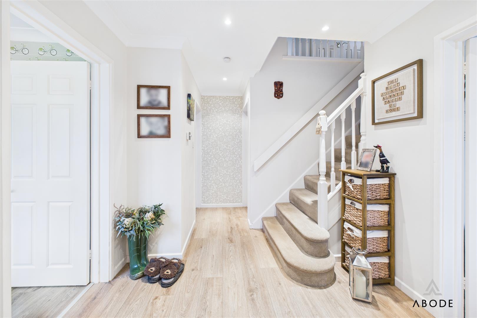 You enter the property into a bright, wide entrance hallway with modern flooring, neutral décor and stairs rising to the first floor. From here, doors lead to the principal ground-floor rooms.